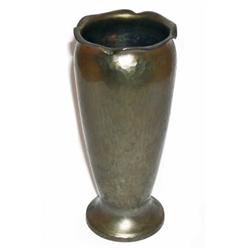 Roycroft vase, footed form with crimped rim in hammered copper, original patina, impressed mark, 6.25”h