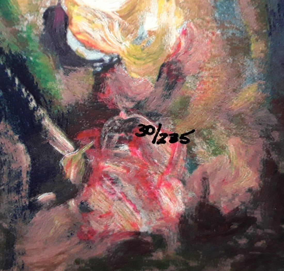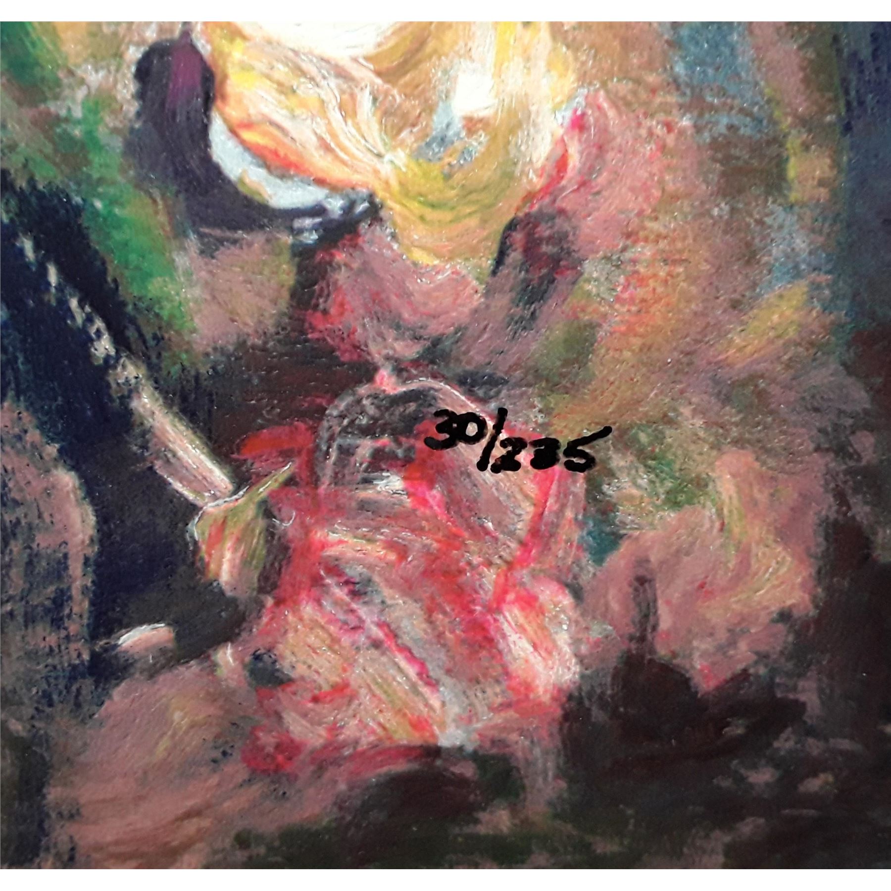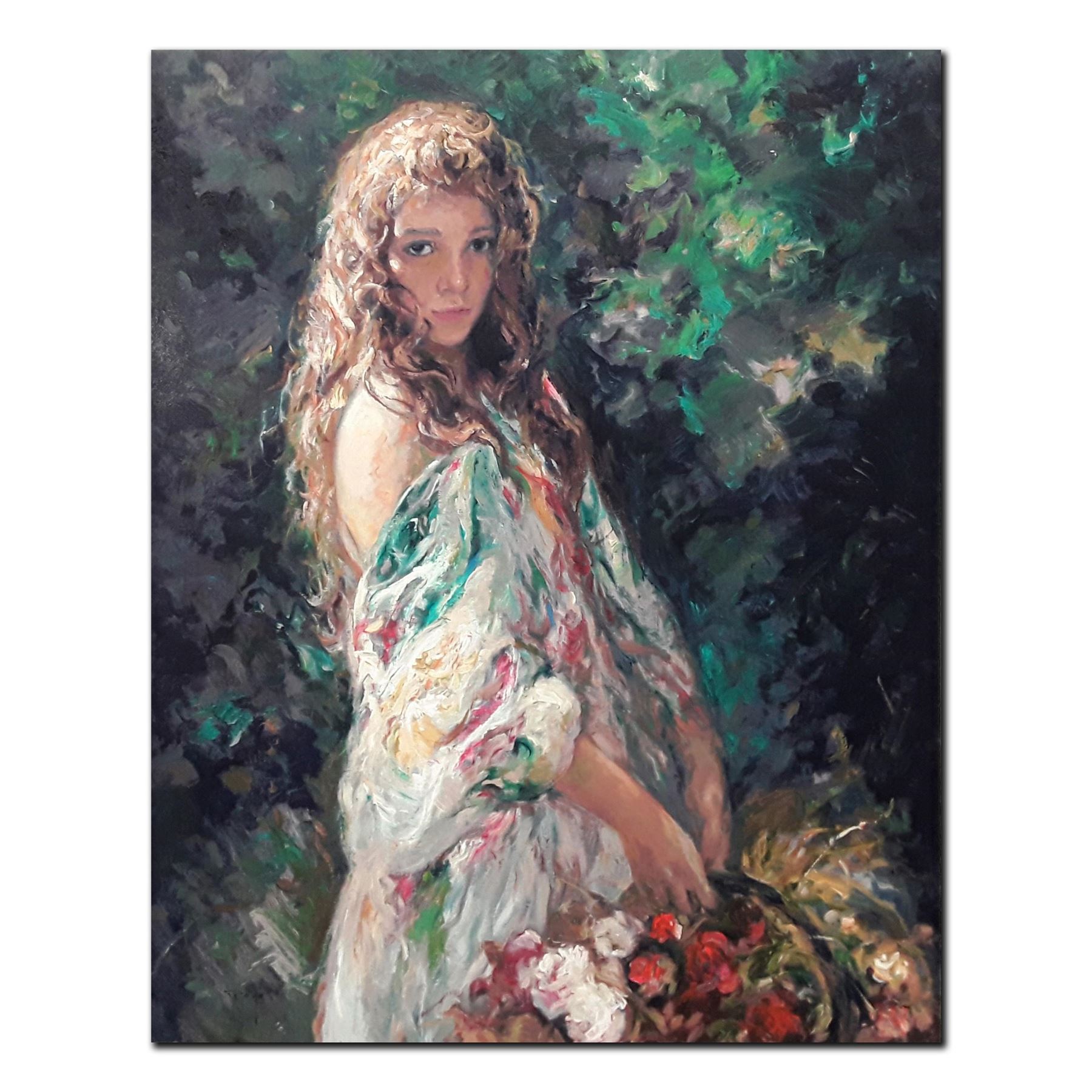 Royo's "El Paseo" limited edition canvas on hardboard, signed and numbered 30/235.This piece is of a woman wearing a white dress, with green, pink and orange accents. She is holding a basket of colourful flowers
