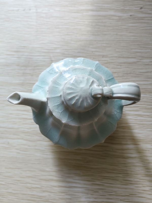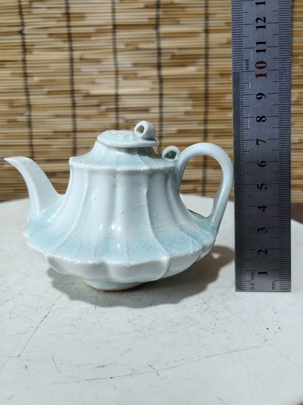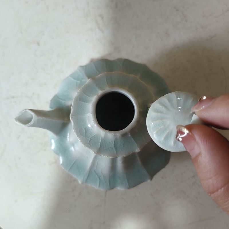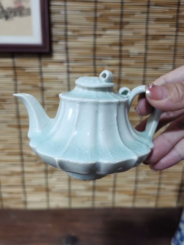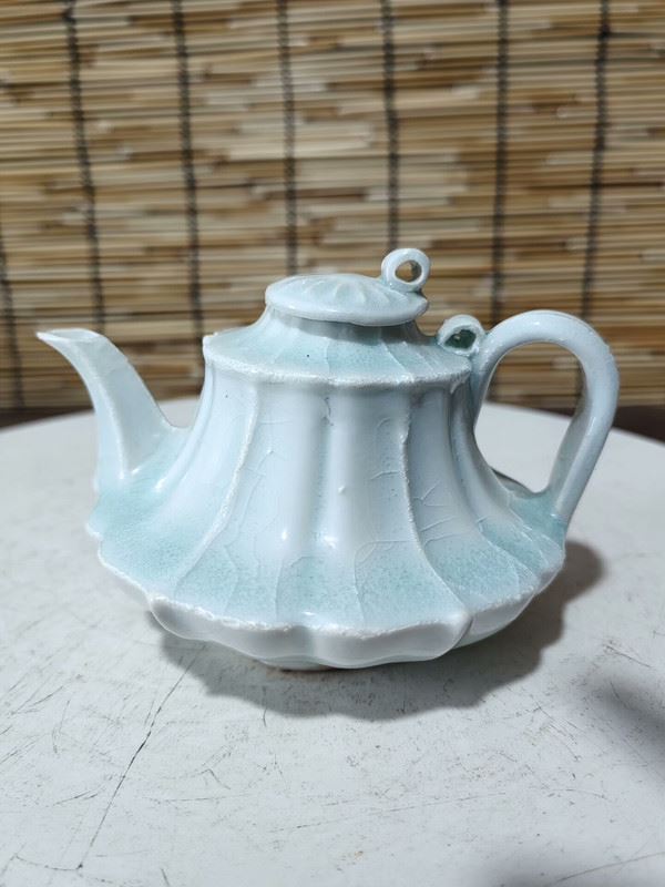 This teapot is glazed in a soft celadon tone, with a smooth and jade-like finish. The body is shaped with melon-rib patterns, creating elegant and harmonious lines. With a well-balanced spout and handle, and a simple yet refined lid design, it exudes a sense of understated beauty. Combining practicality with artistry, this piece serves both as a functional teapot and as a collectible decorative item.