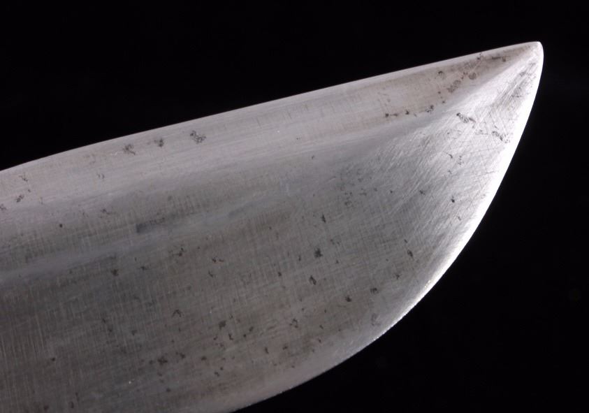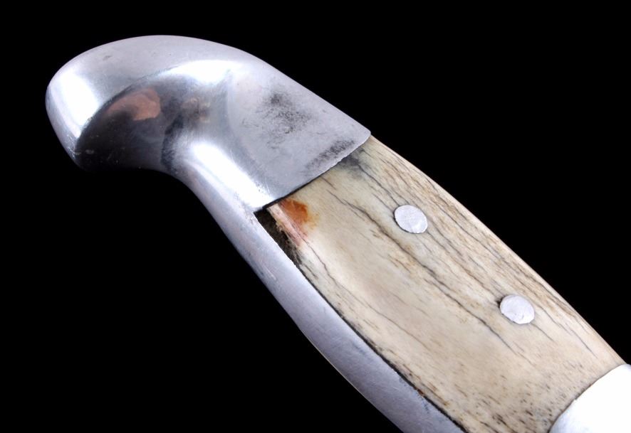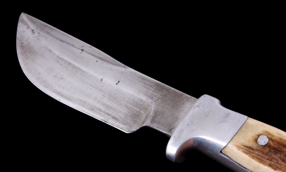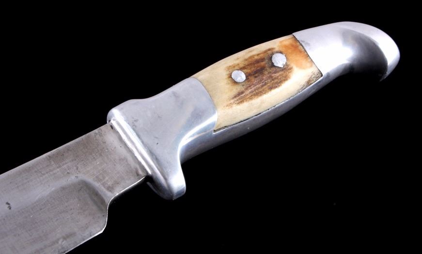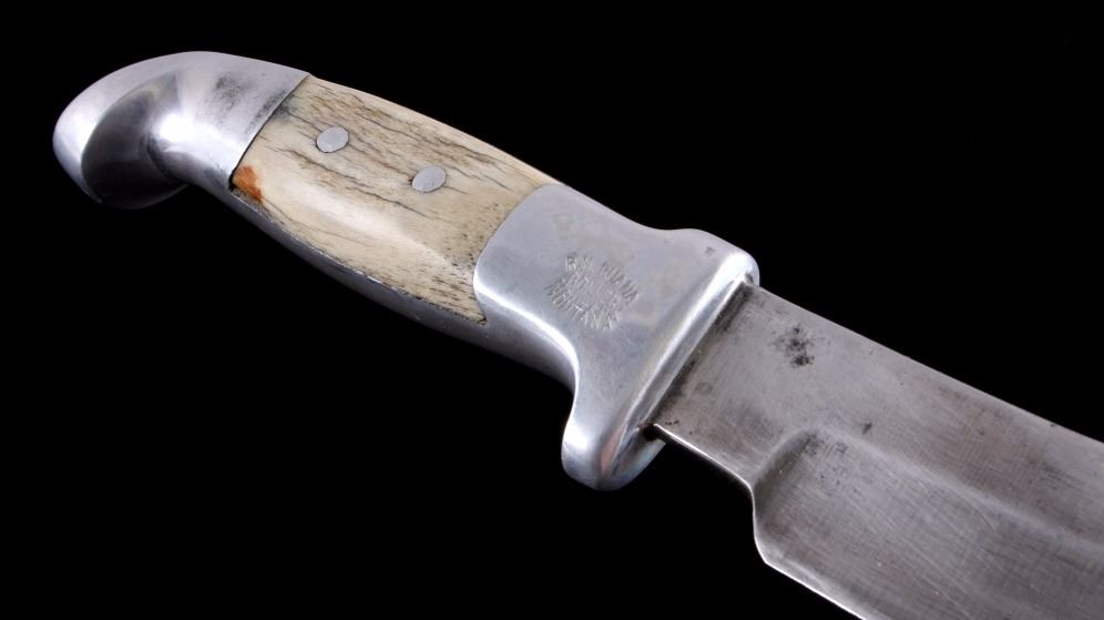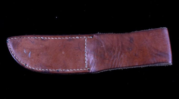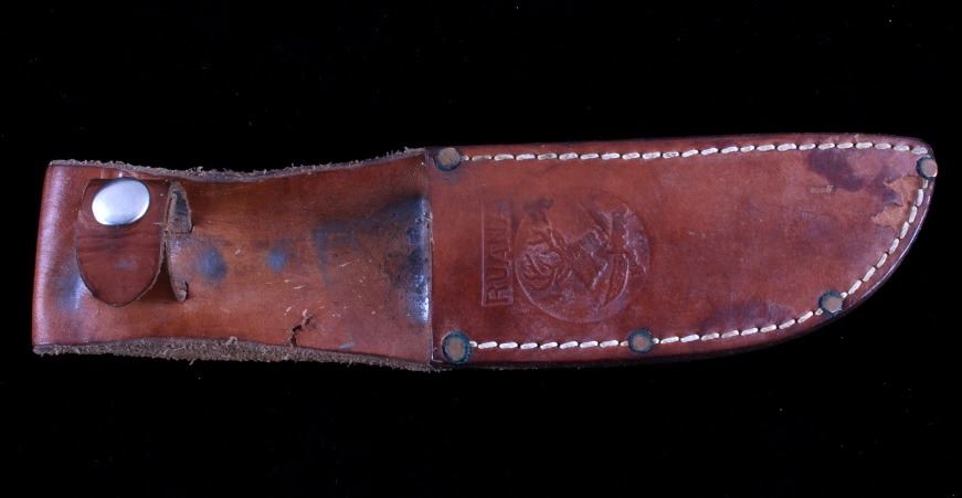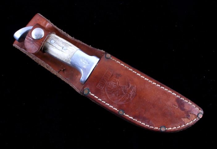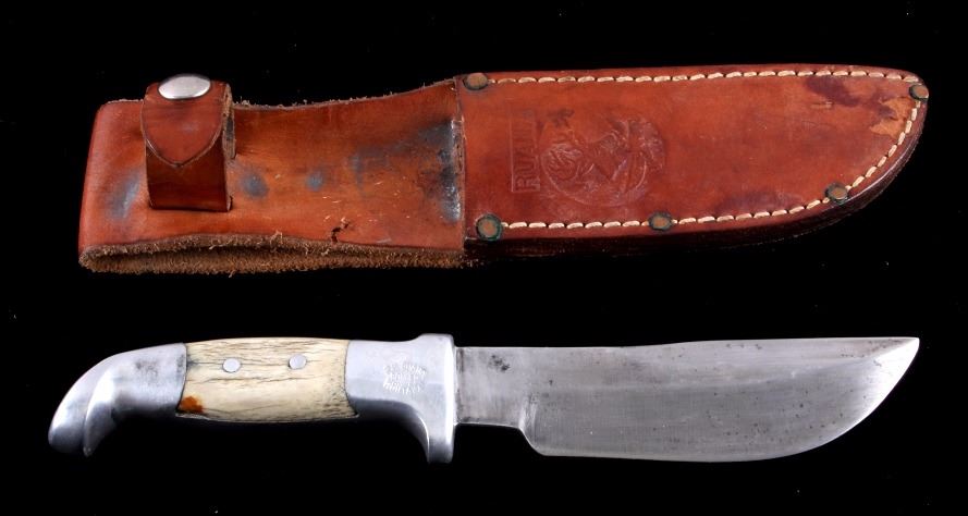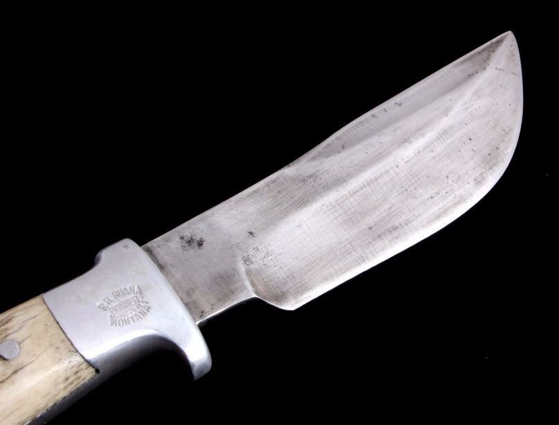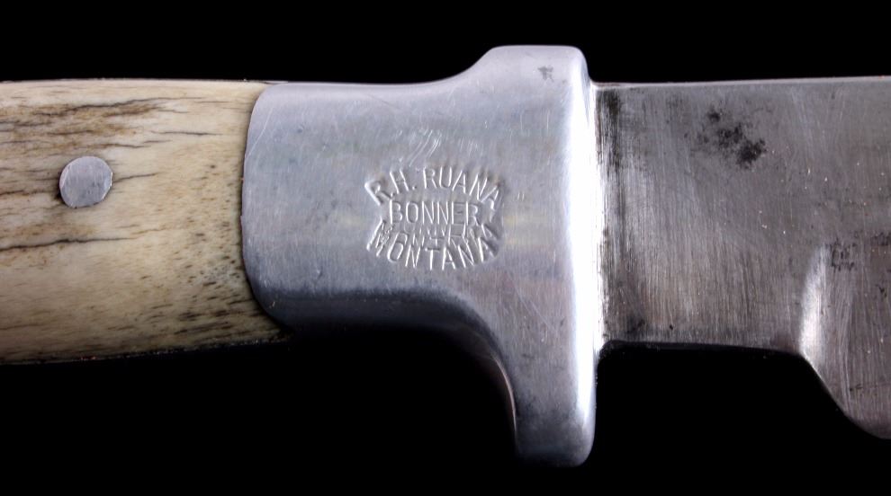 This is an original R.H. Ruana 14B skinner knife and leather scabbard made in 1983. Rudy Ruana began making custom knives in the 1930's. His business has been family owned from the beginning and is still in operation today in Bonner, Montana. Ruana knives are highly regarded and sought after by knife collectors and enthusiasts. The knife features a broad hardened steel blade with an aluminum handle inset with antler grips. The handle is marked "R.H. Ruana Bonner Montana", a hallmark that was only used in 1983. As told by his grandson, "Rudy got tired of people asking what the 'M' stamp meant, so it was no longer used from 1983 on". In 1984, the hallmark was changed to "Ruana Bonner Montana" thus dropping the "R.H.". The knife comes with the original leather scabbard marked "Ruana" showing the deer head and crossed knives logo. The Ruana knife and scabbard are in good condition. The knife measures 9.25" with a 4.5" blade.
