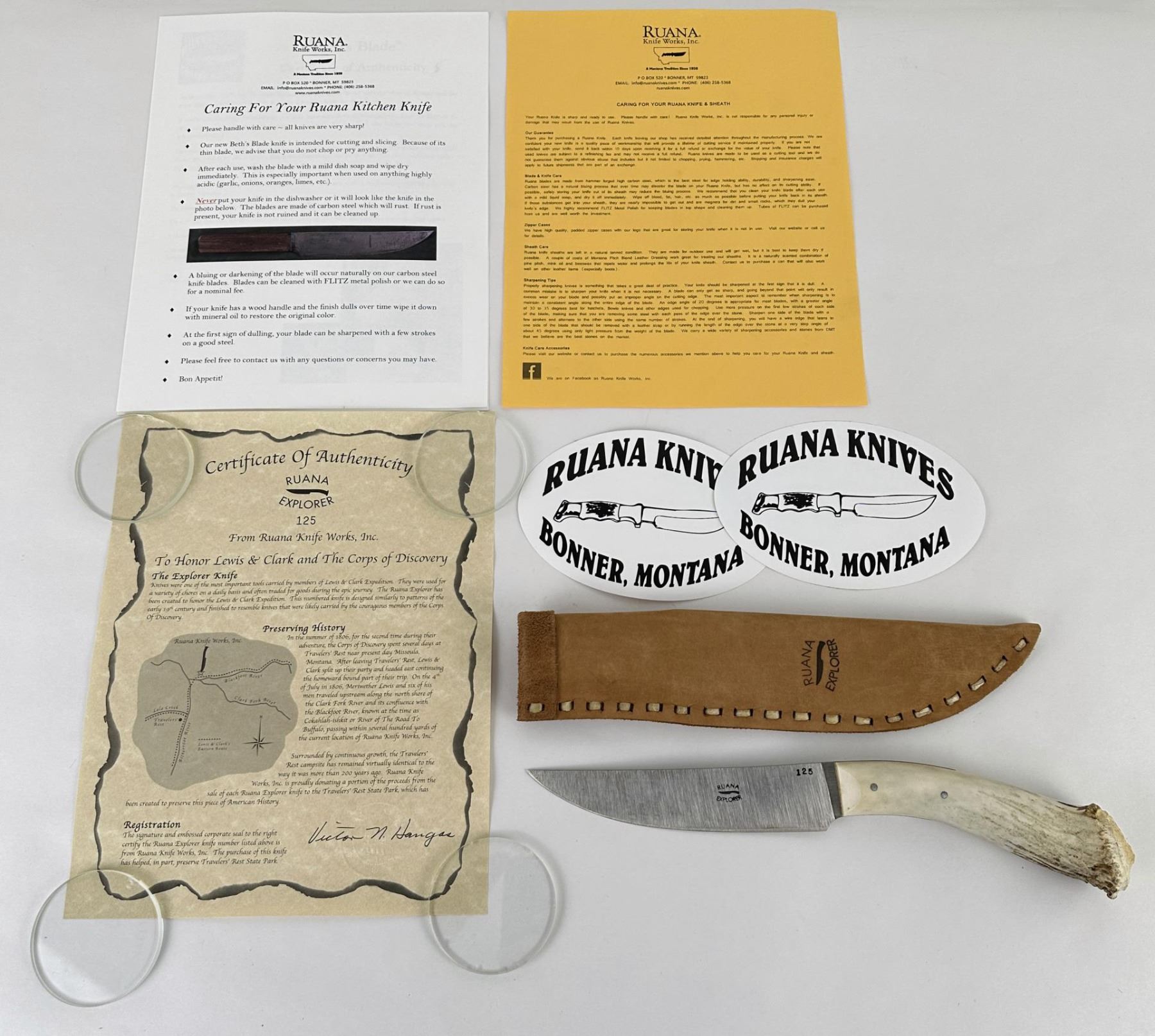 Measures 12" long. Includes sheath, care instructions, COA, and stickers.
