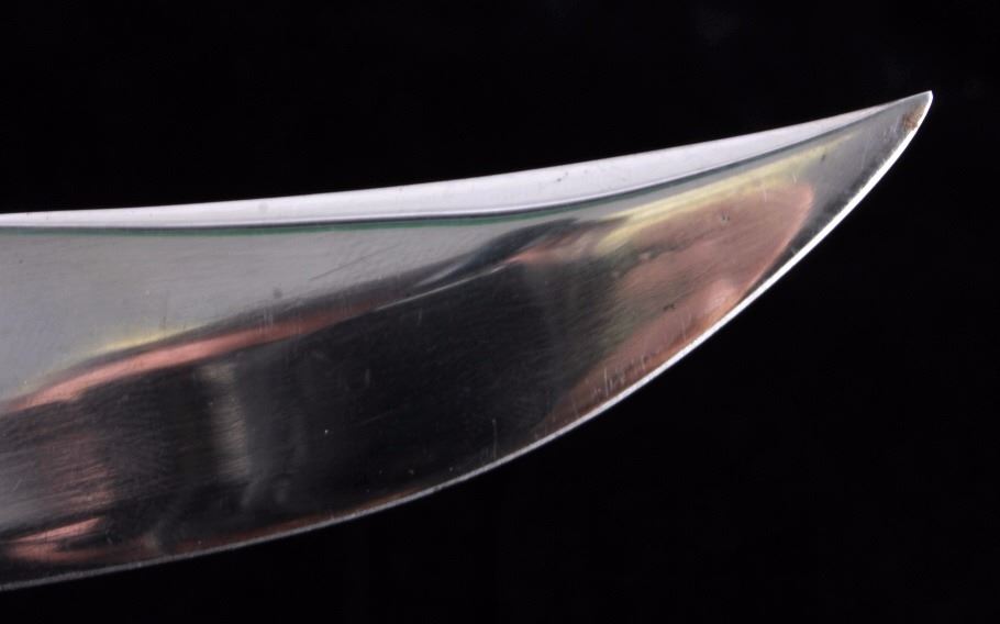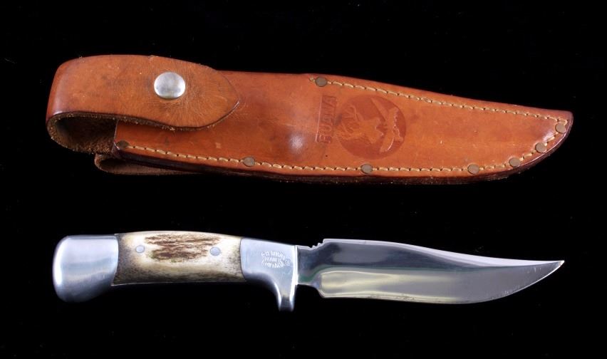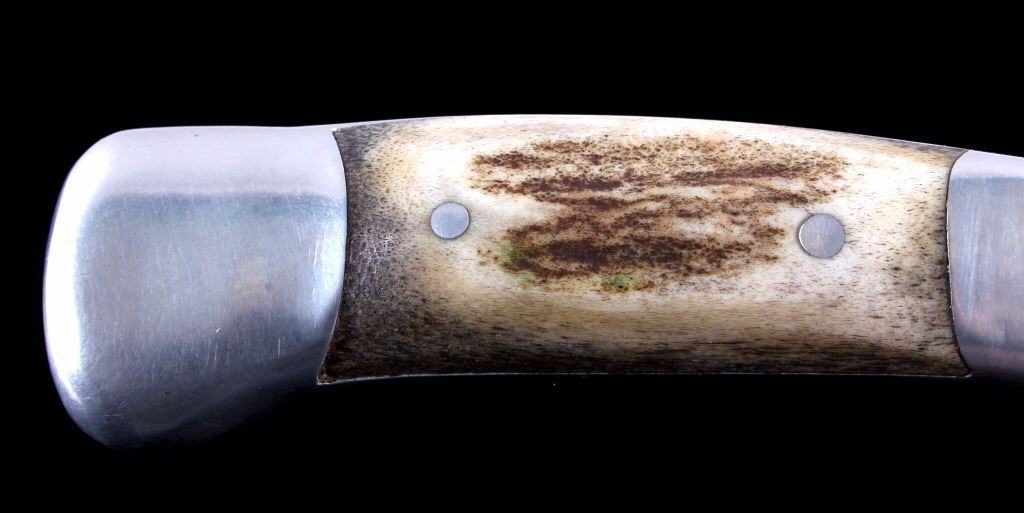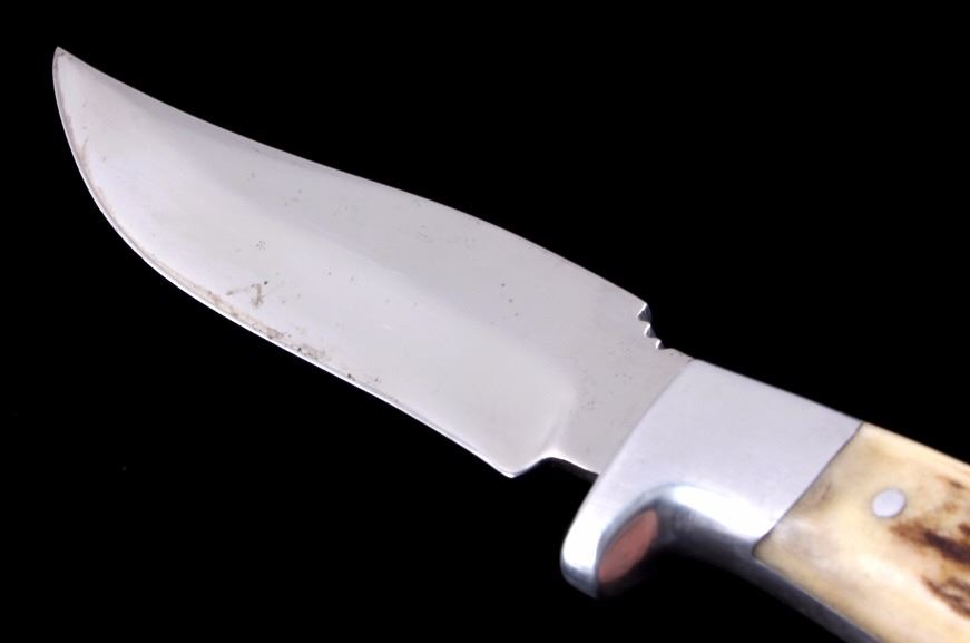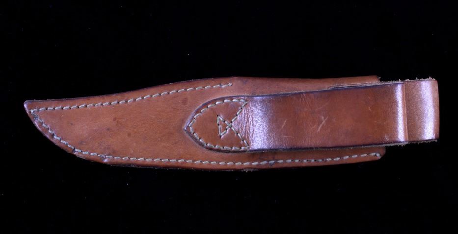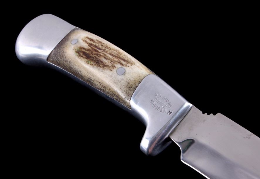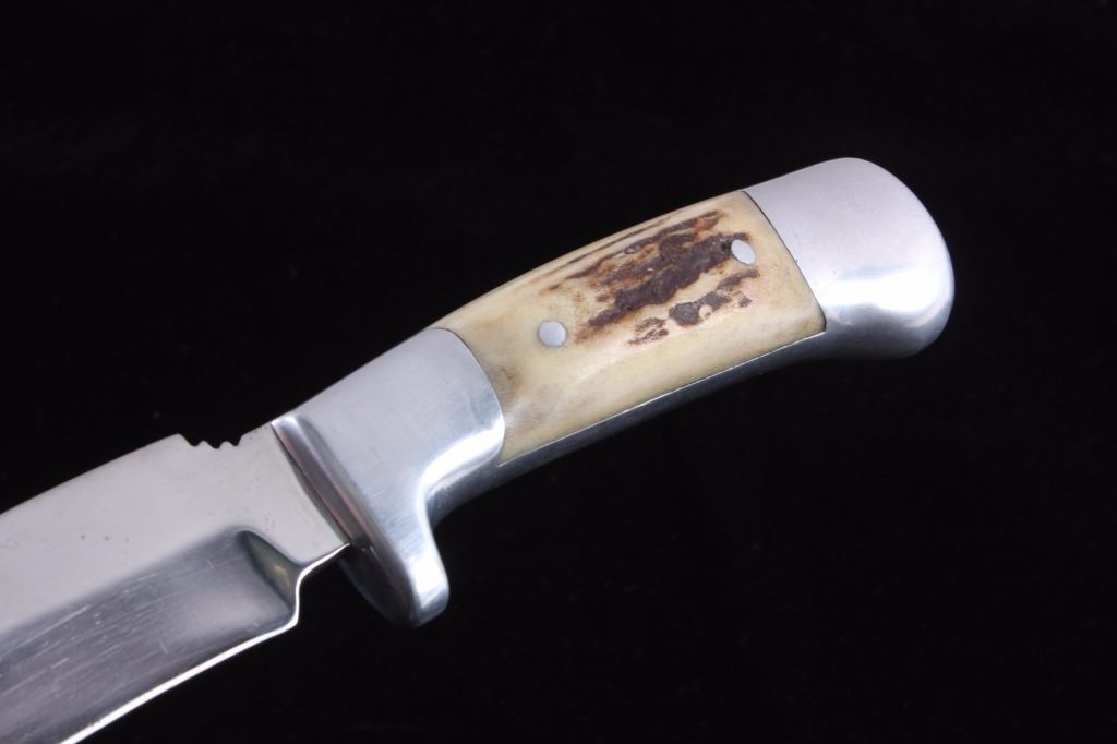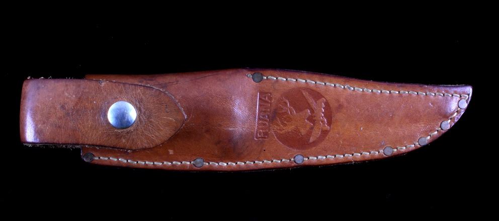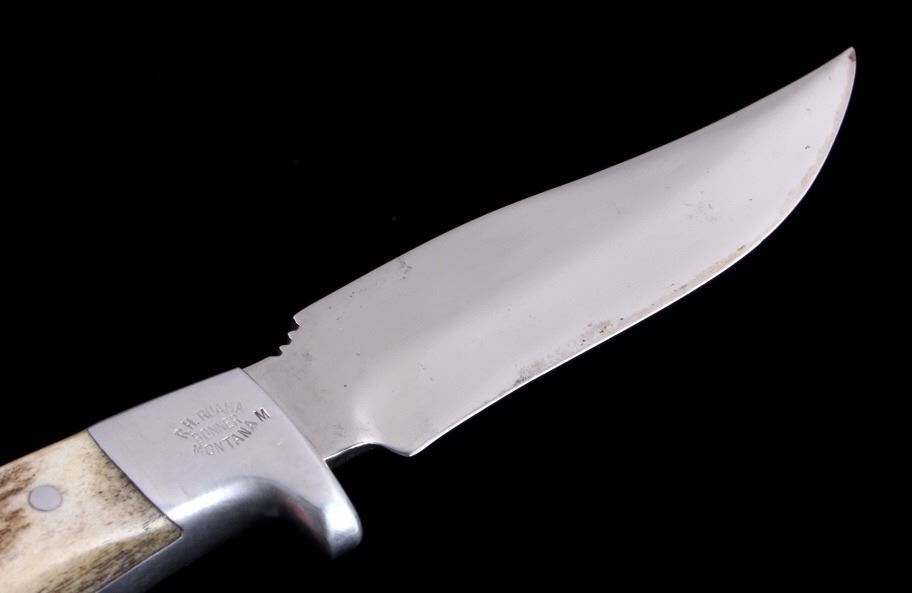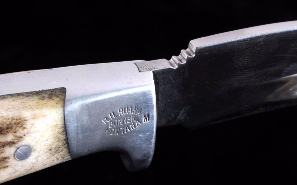 This is an original R.H. Ruana hunter knife with leather scabbard made between 1962 and 1983. Rudy Ruana began making custom knives in the 1930's. His business has been family owned from the beginning and is still in operation today in Bonner, Montana. Ruana knives are highly regarded and sought after by knife collectors and enthusiasts. This knife features a hardened steel blade with a sweeping curve. The handle is made from aluminum with inset antler grips. The handle is stamped "R.H. Ruana Bonner Montana" and is marked "M", a hallmark used by Ruana from 1962-1983". The scabbard is made from leather and is marked "Ruana" with the deer head and crossed knives. The Ruana knife and scabbard are in good condition. The knife measures 9.5" with a 4.5" blade.