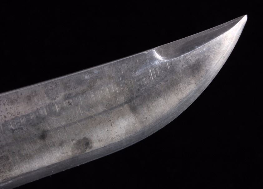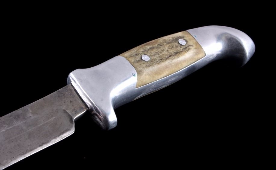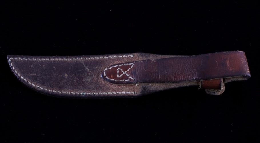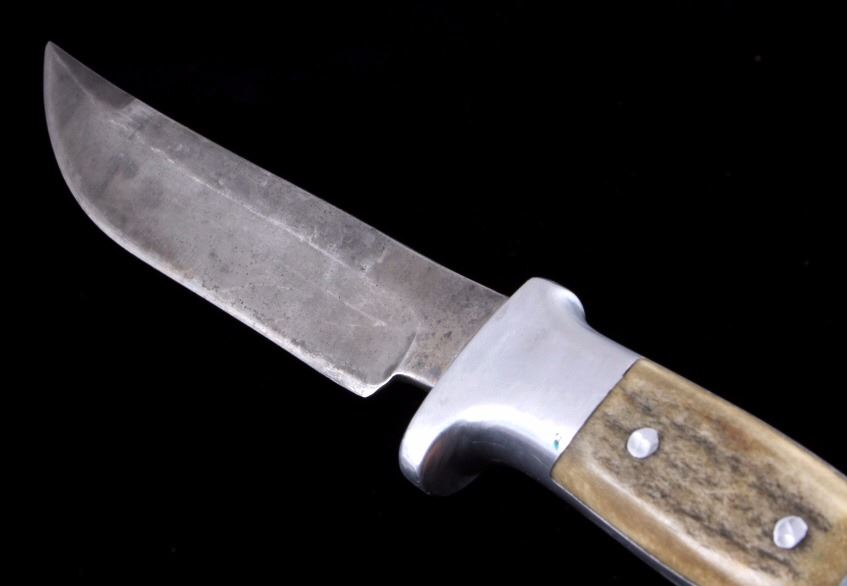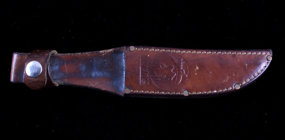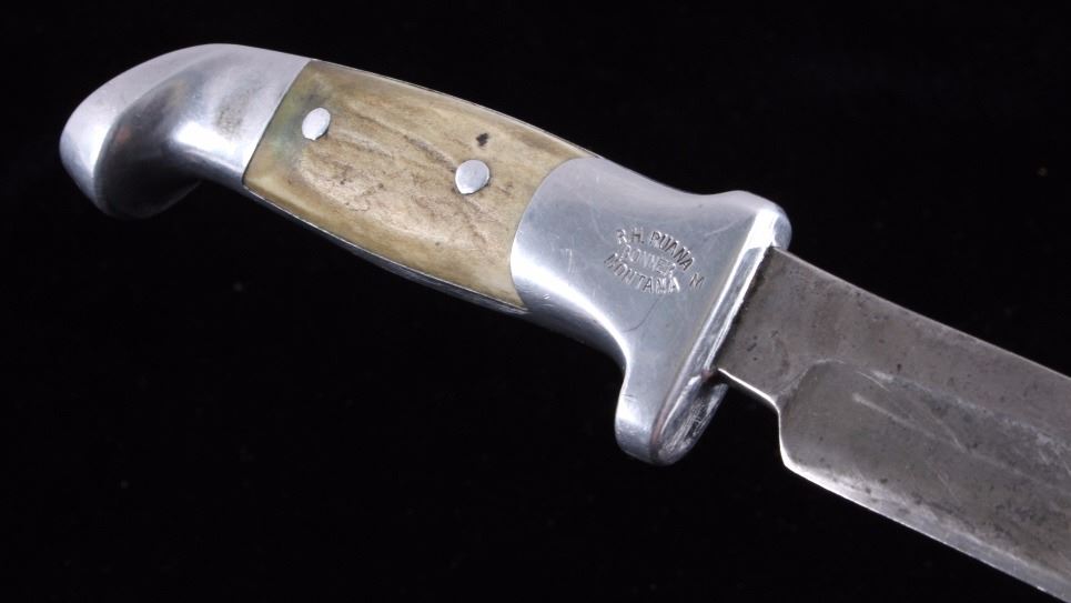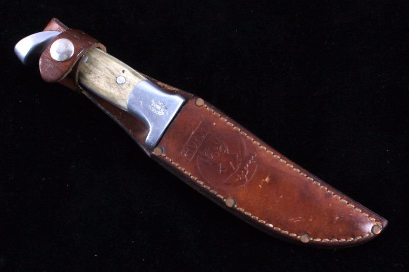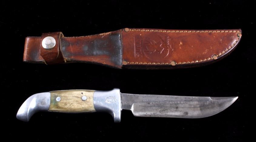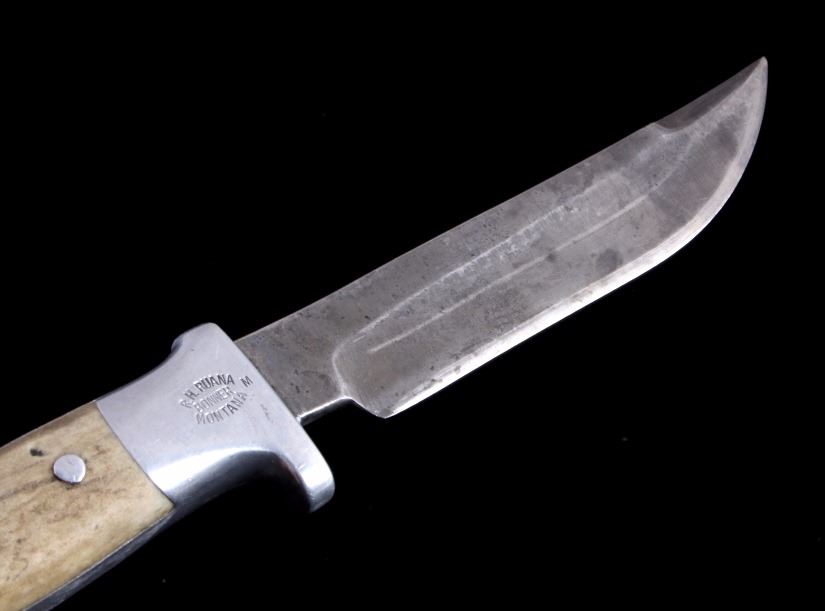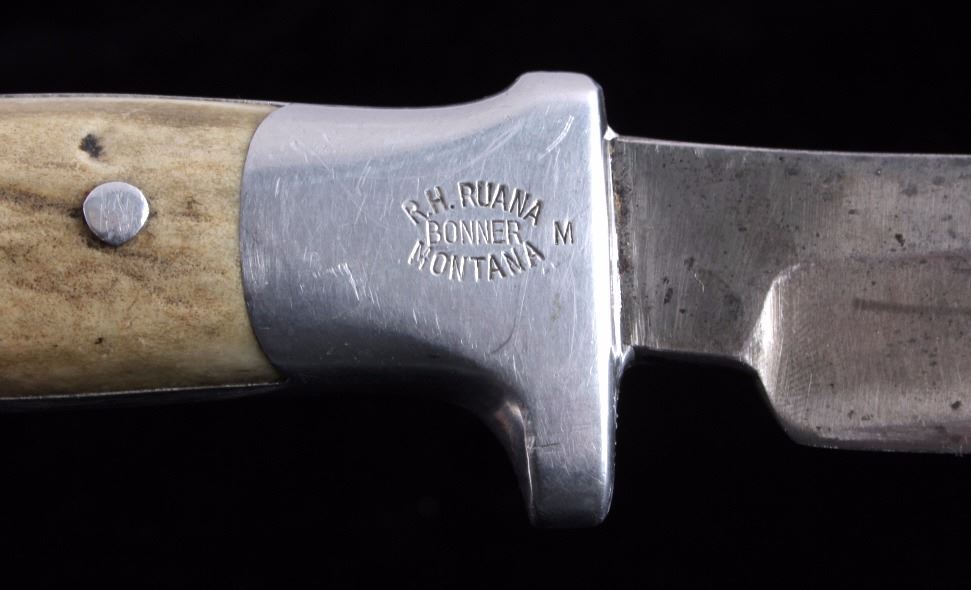 This is an original R.H. Ruana "M" stamped sticker knife made between 1962 and 1983. Rudy Ruana began making custom knives in the 1930's. His business has been family owned from the beginning and is still in operation today in Bonner, Montana. Ruana knives are highly regarded and sought after by knife collectors and enthusiasts. The knife features a drop point hardened steel blade with an aluminum handle inset with antler grips. The handle is marked "R.H. Ruana Bonner Montana", a hallmark used from 1962 to 1983. The knife comes with the original leather scabbard that is marked "Ruana" and shows the deer head and crossed knives logo. The Ruana knife is in good condition. It measures 9.5" with a 4.5" blade.