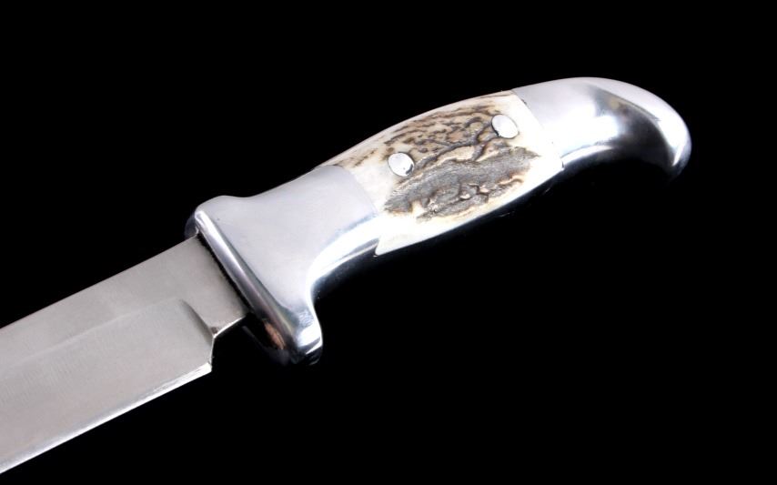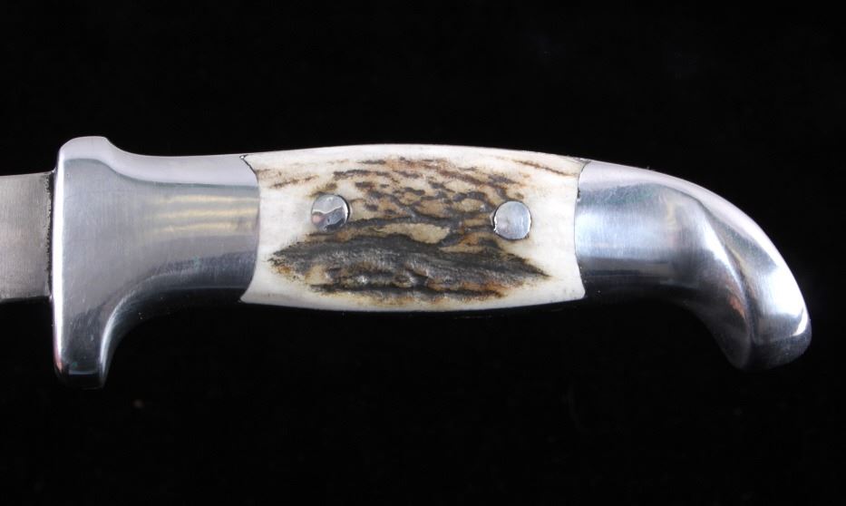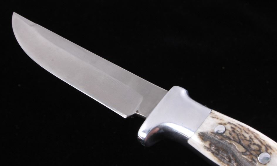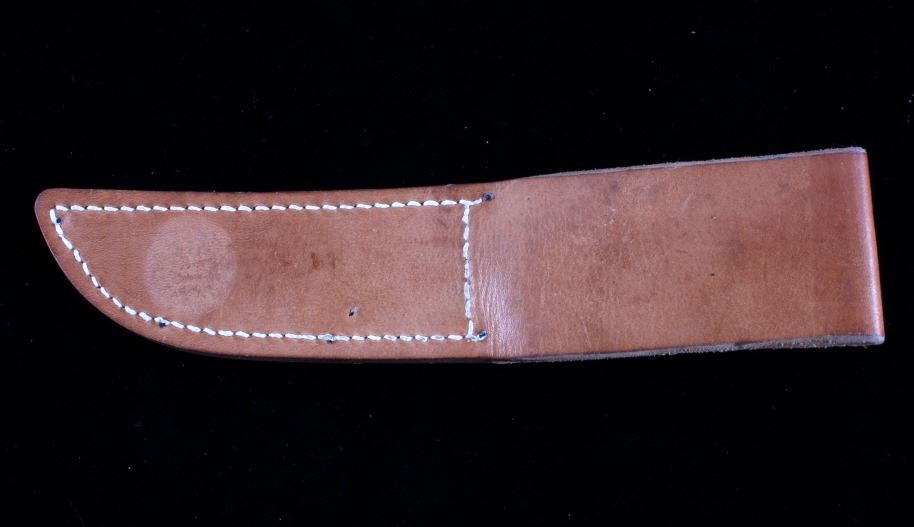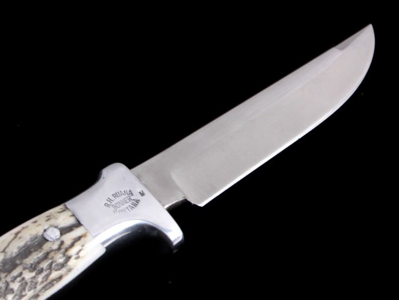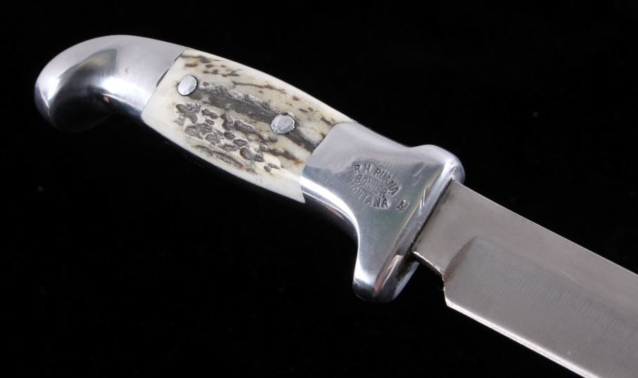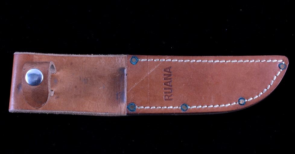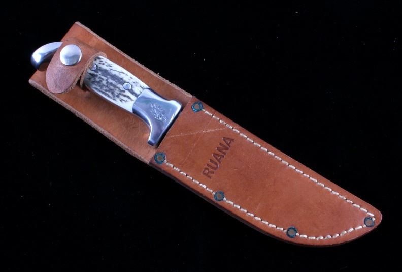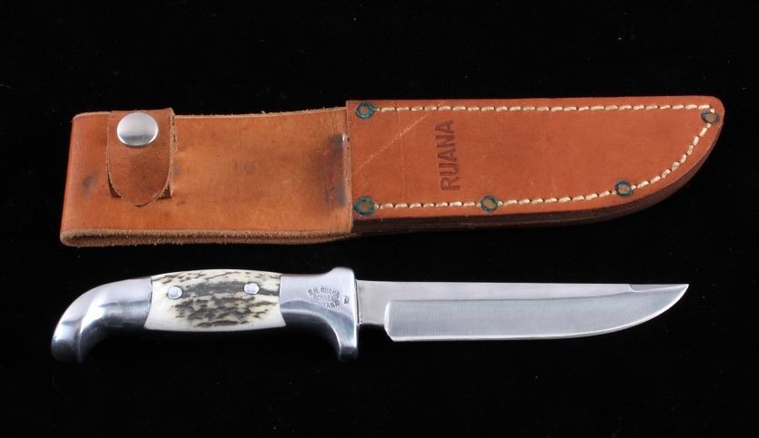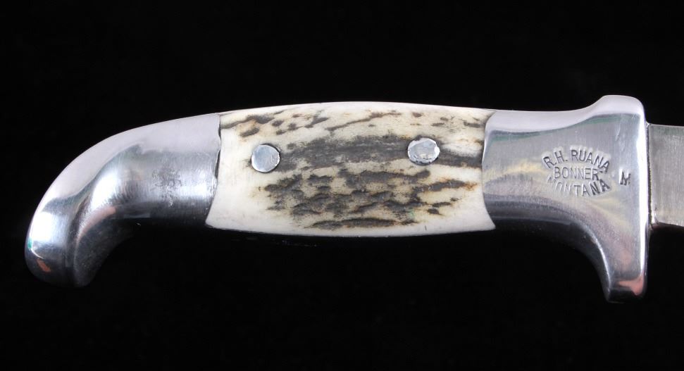 This is an original R.H. Ruana "M" stamped sticker knife with leather scabbard.Rudy Ruana began making custom knives in the 1930's. His business has been family owned from the beginning and is still in operation today in Bonner, Montana. Ruana knives are highly regarded and sought after by knife collectors and enthusiasts. The knife features a hardened steel blade with an aluminum handle inset with antler grips. The handle is marked "R.H. Ruana Bonner Montana" with the "M" stamp, a hallmark used from 1962-1983. The knife comes with a leather scabbard marked "Ruana". The Ruana knife and scabbard are in good condition. The knife measures 9" with a 4.25" blade.