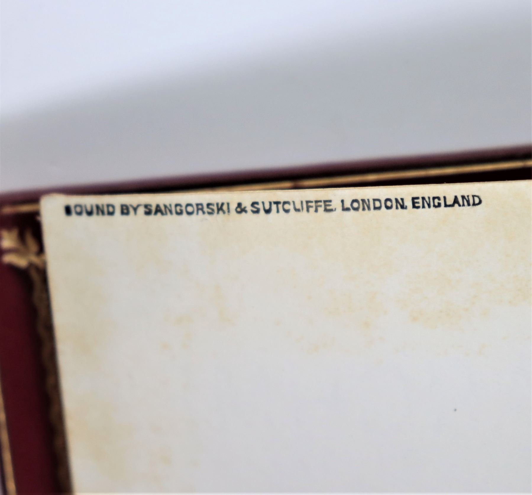 The book was published by Hodder and Stoughton Circa 1910 and bound by Sangorski and sutcliffe, one of the foremost bookbinders on England in the early 1900's. The book was illustrated by Edmund Dulac, a French artist influenced by William Morris and Aubrey Beadsley and who used Oriental and Persian motifs in his works. The book is done in Morocco leather, it has 189 pages with all edges gilt, a gilt-decorated cover, five raised bands with six gilt panels on the spine, and 12 beautiful color plates by Dulac. The book is inscribed "Phoebe S. Harvey 1928" in the front; she was probably the original owner of the book. The book comes with two red ribbon markers and its original slipcase. You can tell because the pattern on the slipcase matches the pattern on the front and rear end papers of the book.