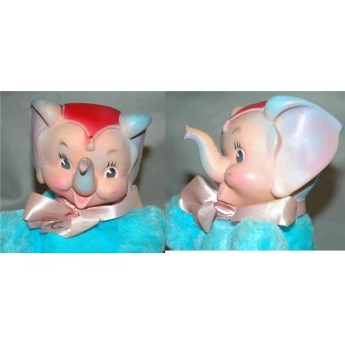 Rare vintage and completely adorable Rubber Face Elephant. The body is a blue plush and it feels like it is stuffed with straw. It meausures 7 1/2" tall. The condition is very good. There is a tiny bit of color loss on the edge of the ears. The one cheek hasd a smudge that I probably should have cleaned off before taking the picture. The smudge is gone nwo. The pink ribbon has a name written on it "Gollum". The fabric is very clean. The manufacturer tag is missing. I assume that this is a Rushton toy. Although I am not so certain to make any absolute statement. It not Rushton then perhaps a "My Toy". Either way you can't go wrong with this vintage toy investement.
