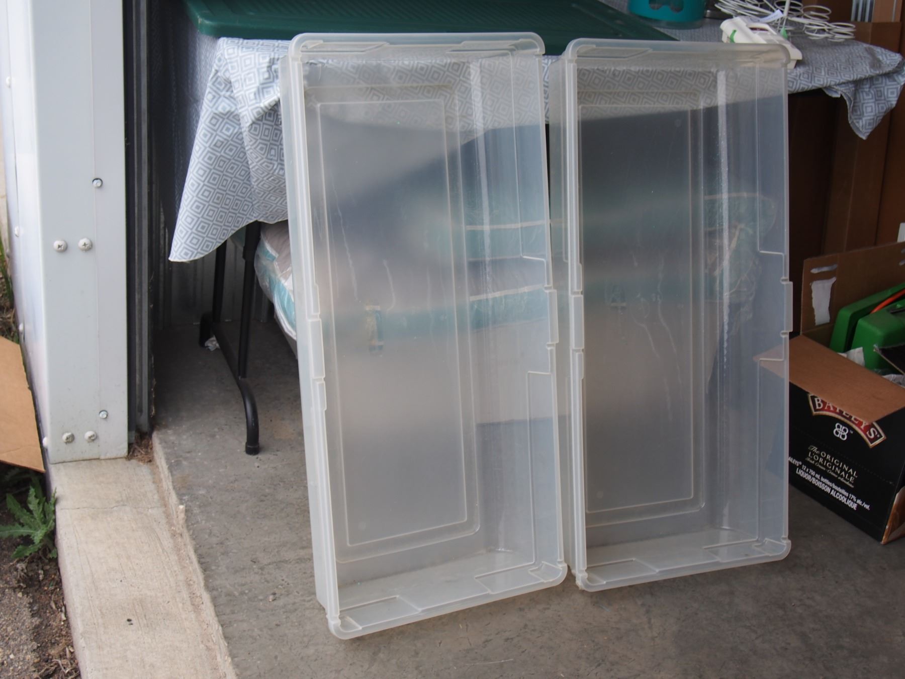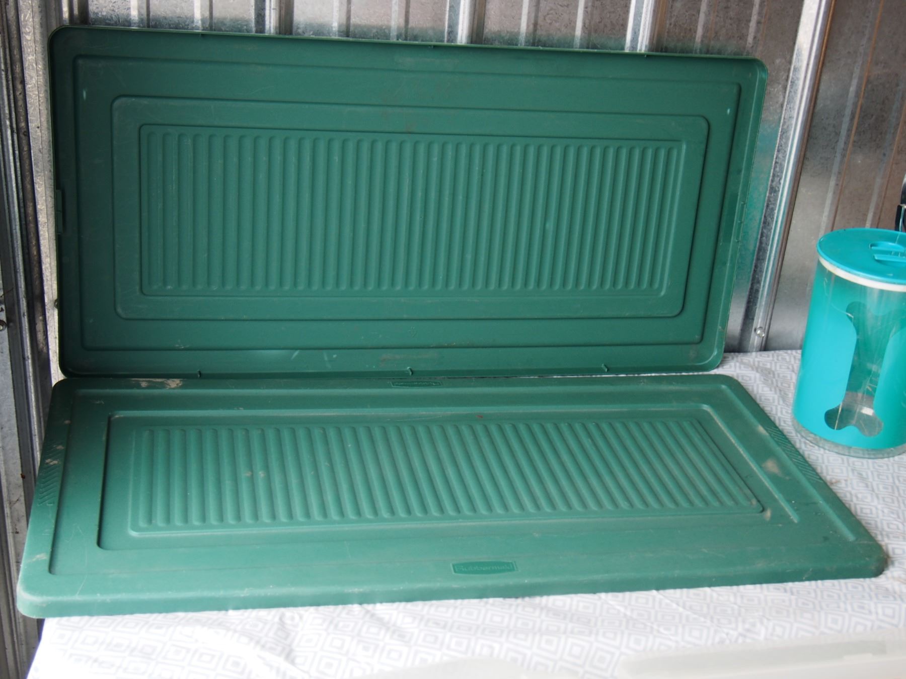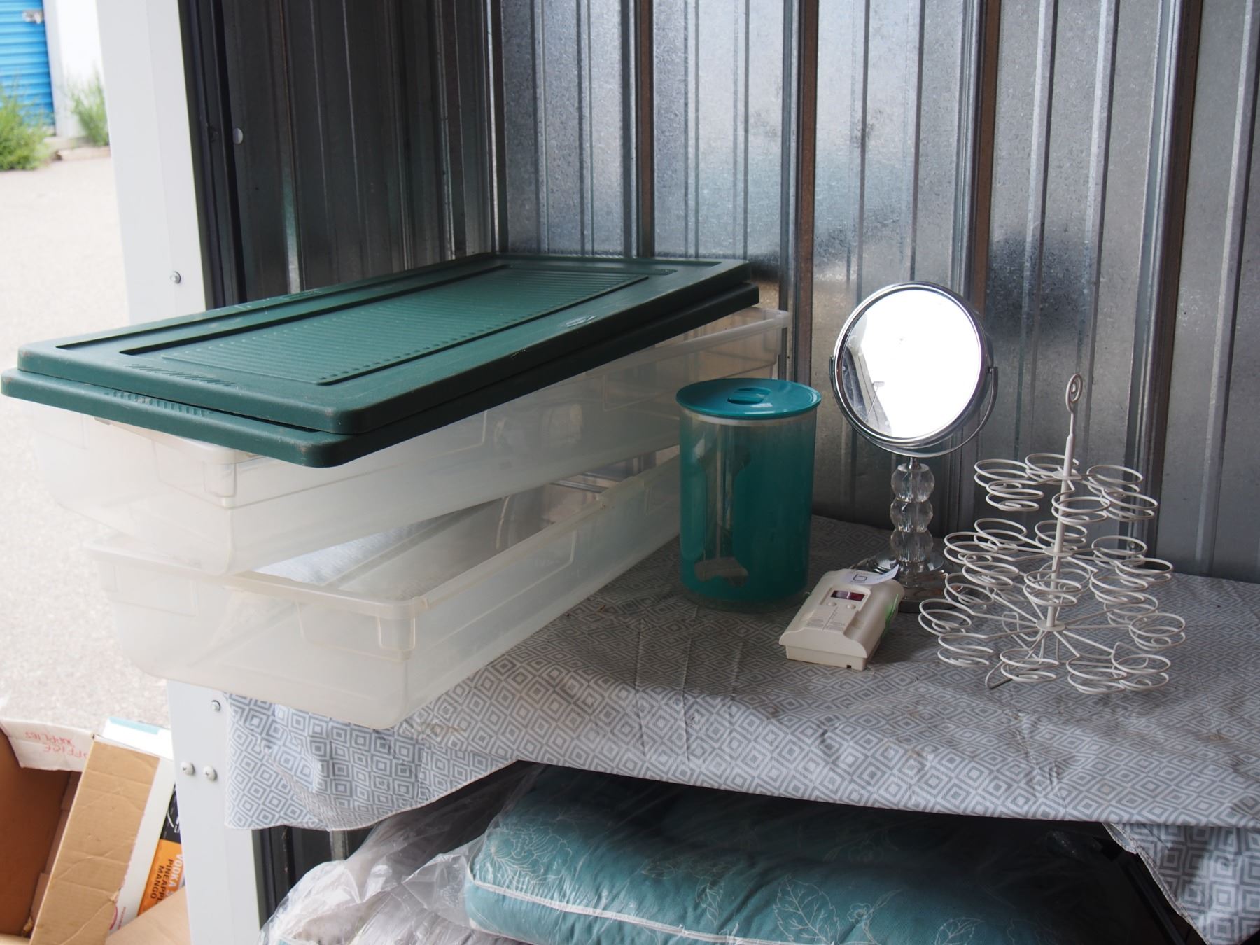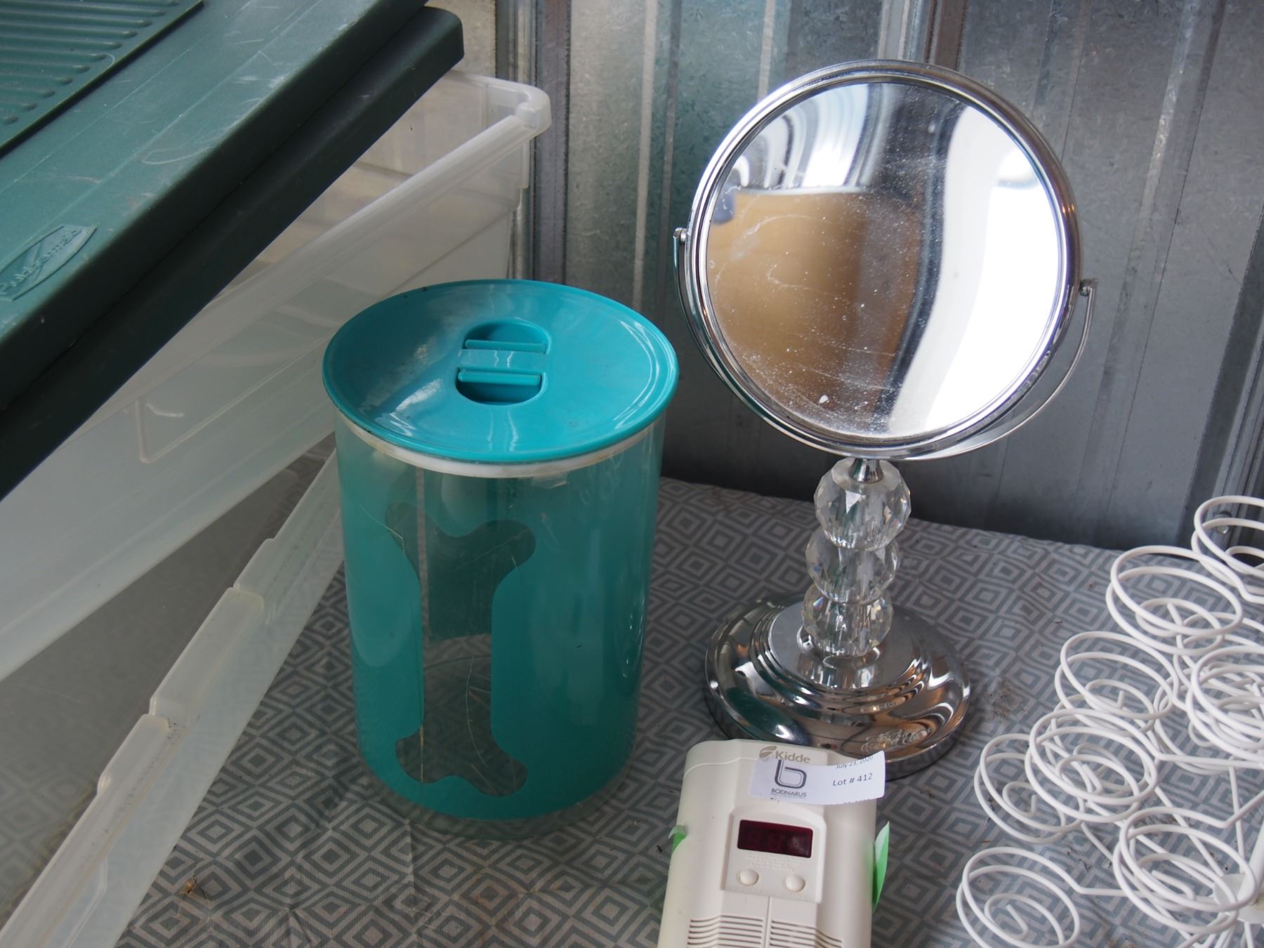 Rubber Maid Totes with Lids, Mirror, Carbon Monoxide Alarm and misc