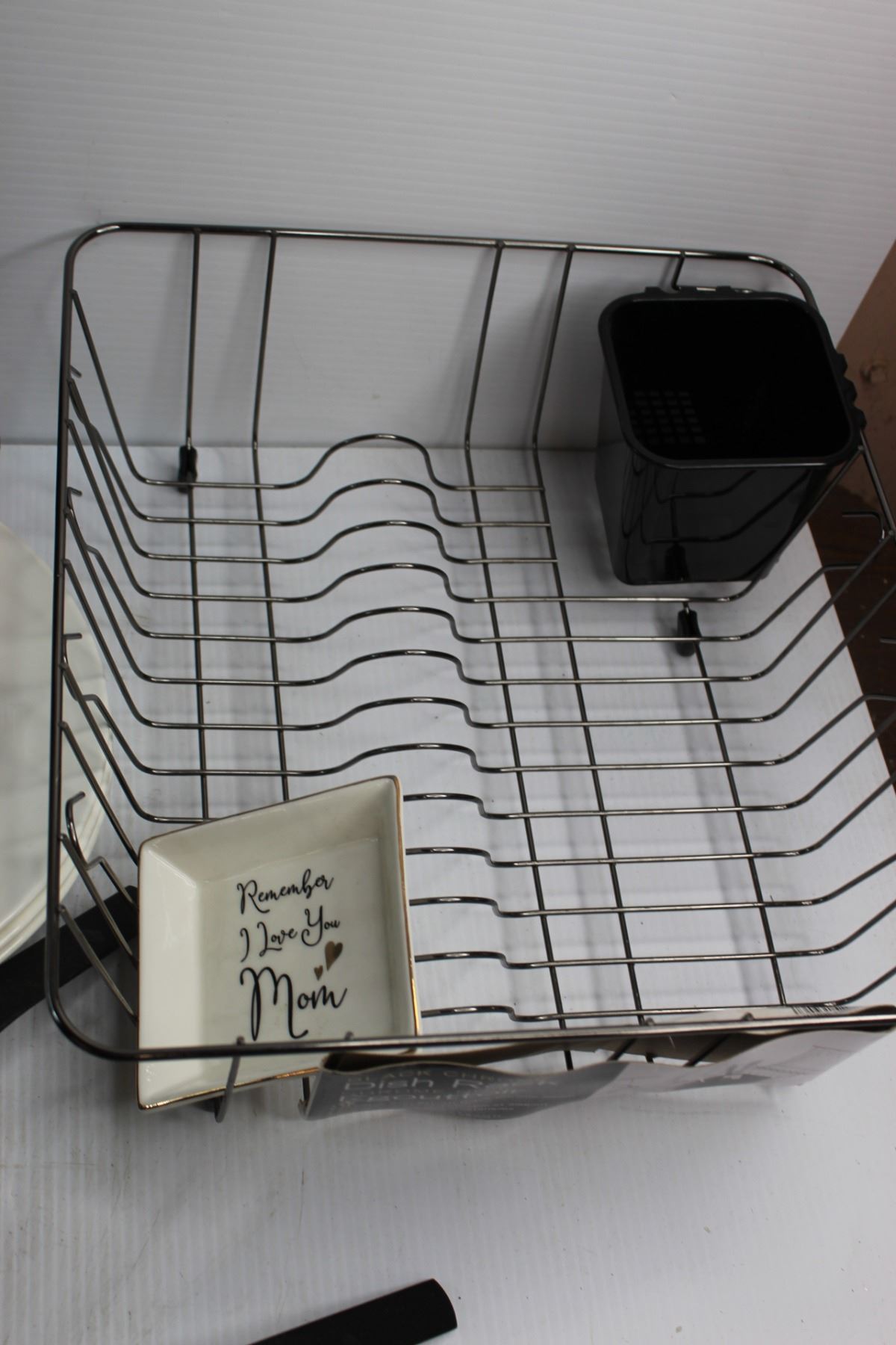 Rubbermaid Dish Rack with Drainboard, Assorted Plates, (2) Bowls and Misc.