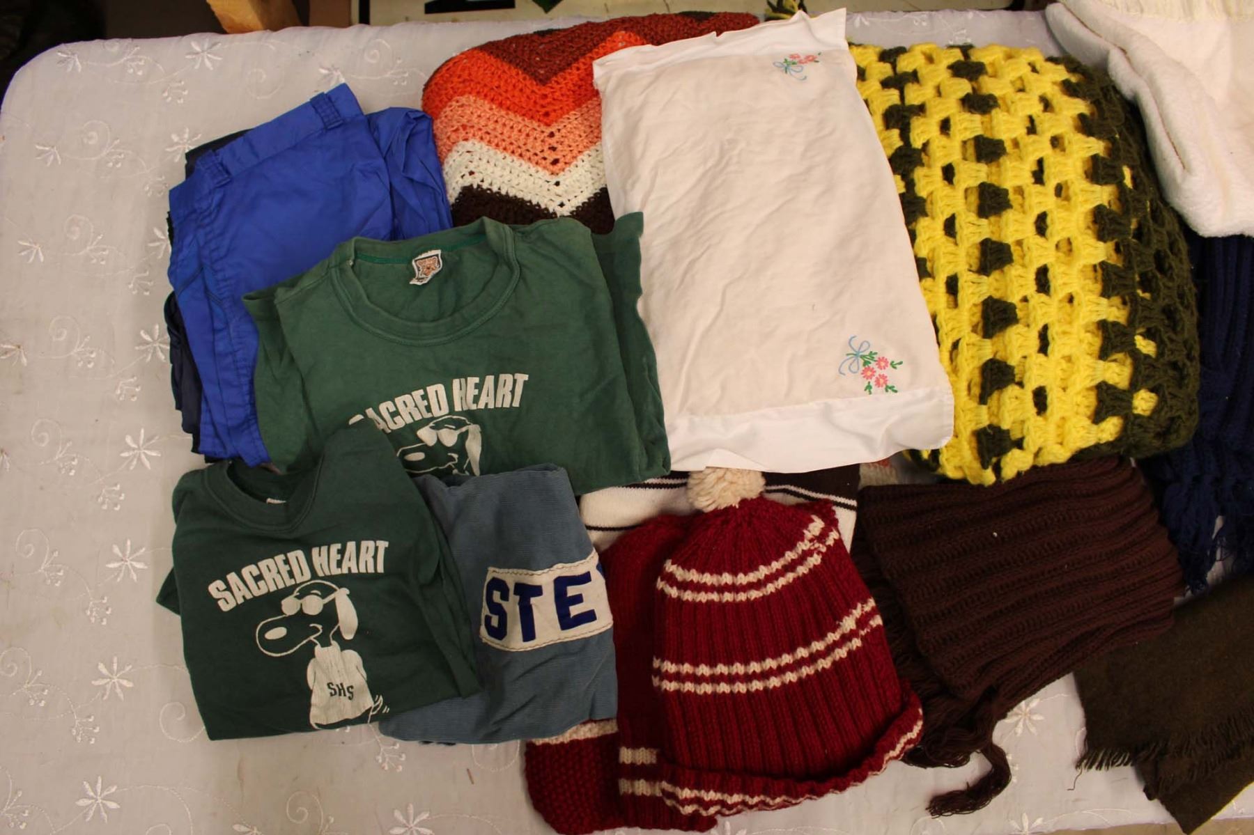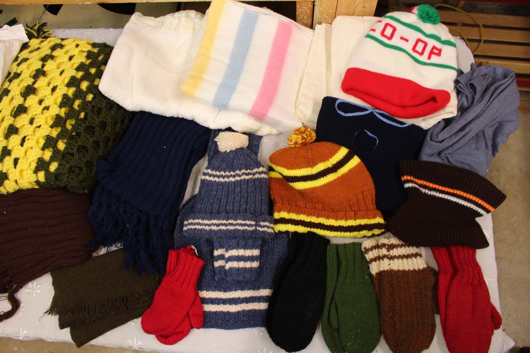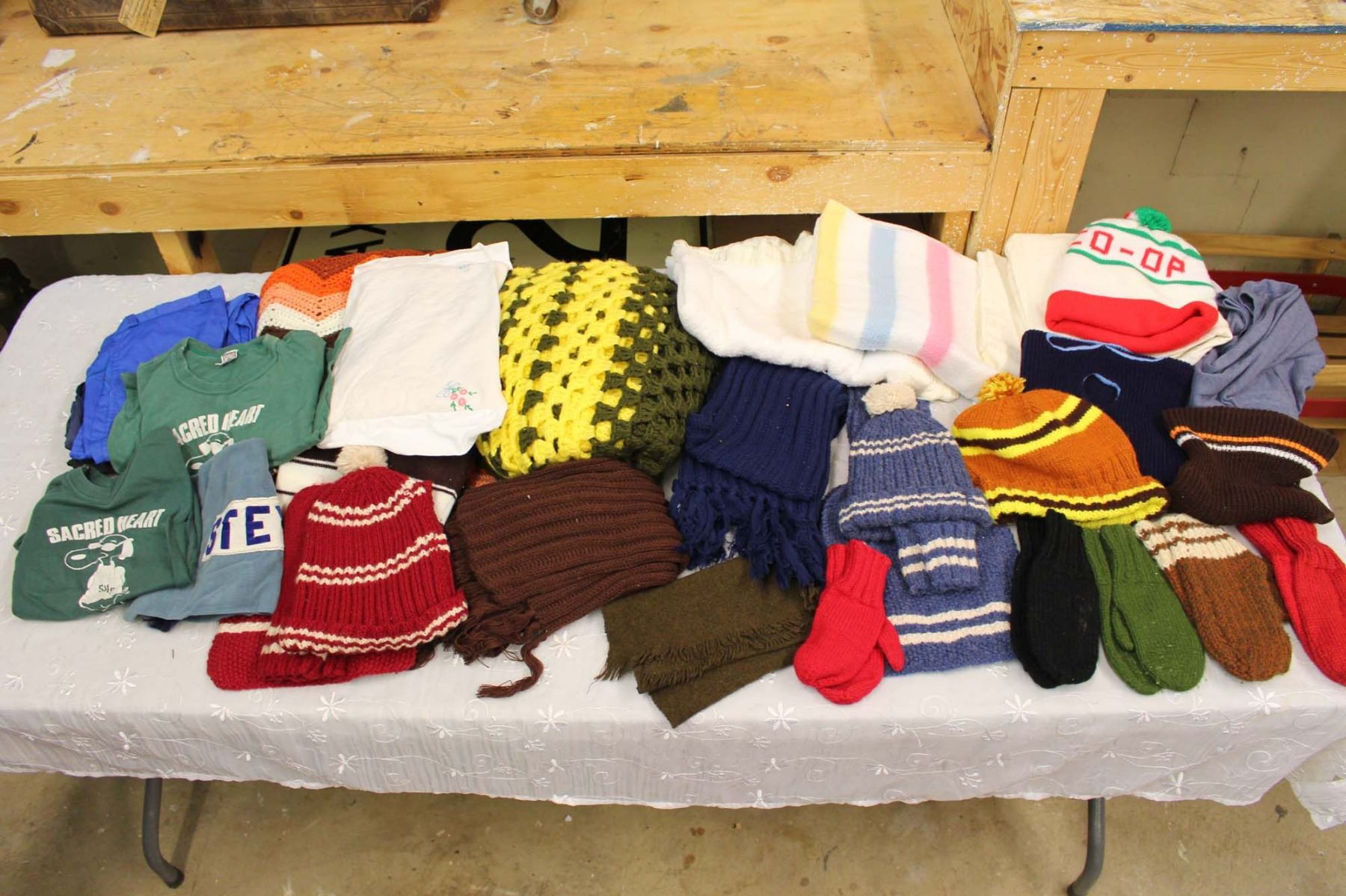Rubbermaid Tub of Misc Linens (Blankets, Winter Wear, Shirts, Sheets)