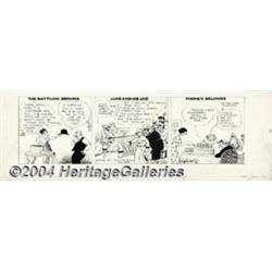 <B>Rube Goldberg - Cartoon Follies of 1927 Daily Comic Strip Original Art, dated 1-12-27 (McNaught Syndicate, 1927).</B></I> Pulitzer Prize winner Rube Goldberg is one of America's favorite cartoonists of all time, and his legacy lives on today, 34 years after his death. Goldberg drew a handful of popular strips, including <I>Foolish Questions</B></I>, <I>Mike and Ike, They Look Alike</B></I>, and <I>Boob McNutt</B></I>; he also drew sports and editorial cartoons. His series of <I>Crazy Inventions</B></I> so captured the fancy of his readers (with nutty items like the "Simplified Pencil Sharpener" that was anything but) that the term "Rube Goldberg Device" became a popular phrase. In fact, "Rube Goldberg Machine" contests are still being held on a regular basis today! This offering is an early strip comprised of three reoccuring features: "the Battling Browns", "Luke and his Uke" (featuring crazy rhymes sent in by readers), and "Phoney Bolonies", all of which gave Goldberg plenty to poke fun at. The strip measures approximately 21" x 7.5", with an image area of 17" x 5". The original artboard has been reinforced by another piece of board attached to the back for added strength. The board is a bit soiled around the edges, but the art itself remains in Excellent condition. <BR><BR><B>Important notice:</B> Heritage usually auctions material at the rate of 200-250 lots per hour. On some occasions eBay Live bid software or the Internet may not be able to keep up with the pace of the auction. We recommend placing a realistic absentee bid now as insurance to avoid disappointment. Occasionally the auctioneer may eliminate or reject an eBay Live bid, and the auctioneer may also reopen a lot after the close of the eBay live bidding (usually because we missed an audience bid), and may reject your bid even if it shows you as the winning bidder. By bidding via eBay Live, you agree that Heritage may award the lot to another bidder at its sole discretion under the circumstances described above or any other reasonable circumstances. Since eBay bids are not shown to us until we open the lot on the floor, we treat those bids just like floor bids. In most cases the floor responds before the eBay bid is presented to us, due to Internet lag time, so for consistency we have made it a policy that floor bids are always considered first over tie eBay live bids. Also please note that all Heritage lots purchased through eBay Live carry a 20% Buyer's Premium. Please make sure you read the Terms and Conditions before you bid. </span></font></tr></table></td></tr></table>