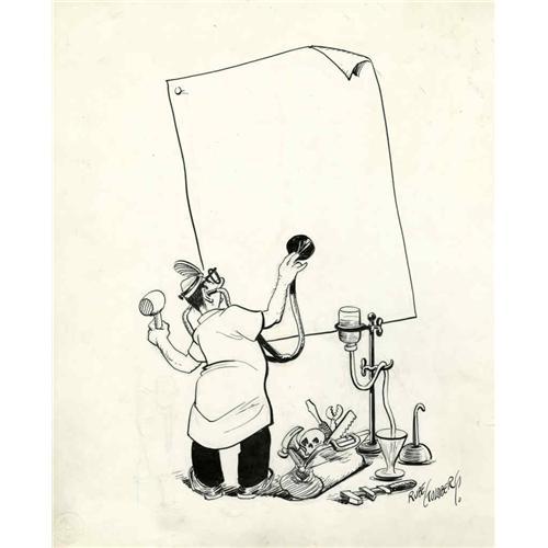 <B>Rube Goldberg - Doctor with Stethoscope Illustration Original Art (undated).</B></I> Rube Goldberg had a thing for gadgets. He earned lasting fame for his "Rube Goldberg machines" -- devices that are exceedingly complex and perform very simple tasks in a very indirect and convoluted way. This unidentified Goldberg illustration features a doctor, and -- you guessed it -- his gadgets! The image area measures 9" x 12" and the condition is Excellent.
