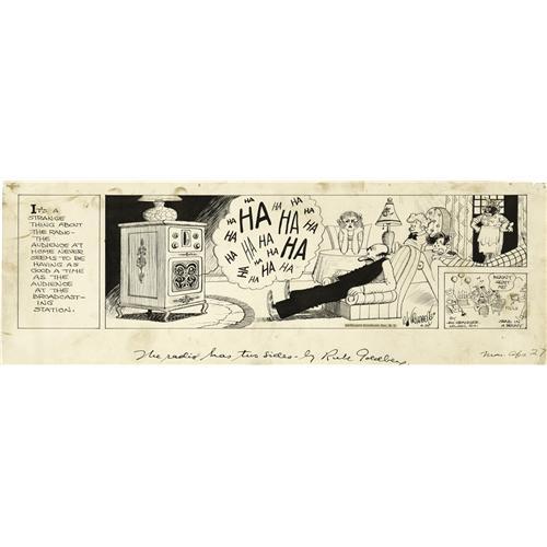 <B>Rube Goldberg - Rube Goldberg Inventions Daily Comic Strip Original Art, dated 4-27 (McNaught Syndicate).</B></I> Who hasn't laughed at a preposterously complicated "Rube Goldberg Device"? Besides those, Rube's takes on other popular inventions kept America in stitches for years. The image area of this hilarious daily measures approximately 17" x 4.5". Other than a few minor stains and overall paper aging, the art is in Very Good condition. <BR><BR><B>Important notice:</B> Heritage usually auctions material at the rate of 200-250 lots per hour. On some occasions eBay Live bid software or the Internet may not be able to keep up with the pace of the auction. We recommend placing a realistic absentee bid now as insurance to avoid disappointment. Occasionally the auctioneer may eliminate or reject an eBay Live bid, and the auctioneer may also reopen a lot after the close of the eBay live bidding (usually because we missed an audience bid), and may reject your bid even if it shows you as the winning bidder. By bidding via eBay Live, you agree that Heritage may award the lot to another bidder at its sole discretion under the circumstances described above or any other reasonable circumstances. Since eBay bids are not shown to us until we open the lot on the floor, we treat those bids just like floor bids. In most cases the floor responds before the eBay bid is presented to us, due to Internet lag time, so for consistency we have made it a policy that floor bids are always considered first over tie eBay live bids. Also please note that all Heritage lots purchased through eBay Live carry a 22.5% Buyer's Premium. Please make sure you read the Terms and Conditions before you bid. This lot is being auctioned in conjunction with a live floor auction by Heritage Auction Galleries. All final auction and invoice information will be supplied by Heritage Auction Galleries, and all other information should be considered preliminary. Lot:41001 <BR><BR><B>Winning Notification and Billing:</B> After the FINAL session in this auction is complete, Heritage will send e-mail and snail mail invoices. This process normally takes several days. All final auction and invoice information will be supplied by Heritage Auction Galleries, and all other information should be considered preliminary. <BR><BR>This auction will be conducted on a live auction floor and over the Internet through eBay Live. If you choose to place an absentee bid, please take a moment to <font color='#0000ff'><u><a href='http://pages.ebay.com/liveauctions/help/before/laabsentee.html'>learn how eBay Live absentee bidding works</a></u></font><font color='#000000'>