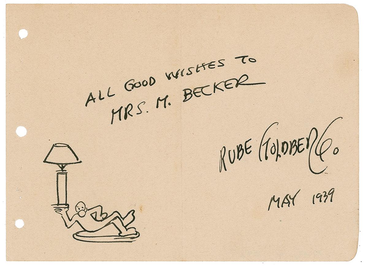Fountain pen signature and inscription, “All good wishes to Mrs. M. Becker, Rube Goldberg, May 1939,” on an off-white 6 x 4.5 album page, with Goldberg adding a small sketch of a figure holding a lamp. A central vertical fold, uniform toning, and a couple of light creases, otherwise fine condition.