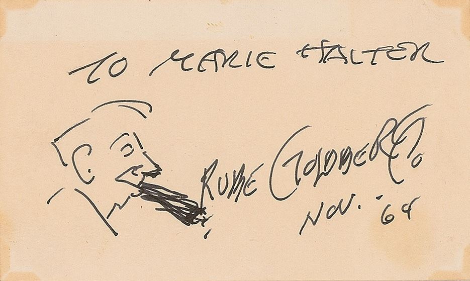 Original vintage sketch of a man in profile smoking a large cigar, accomplished in ink by Goldberg on an off-white 5 x 3 card, signed and inscribed, "To Marie Halter, Rube Goldberg, Nov. '64." In very good to fine condition, with light toning over much of the card.