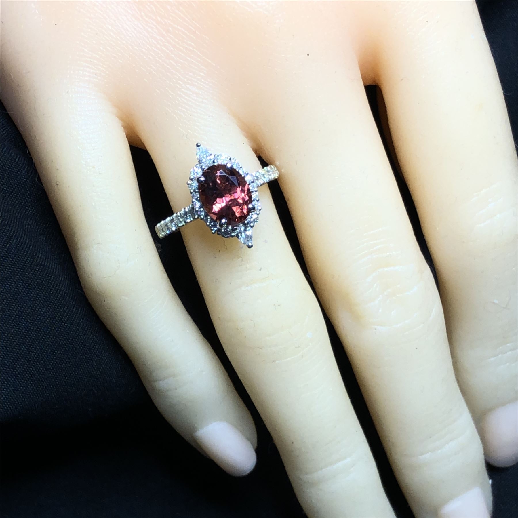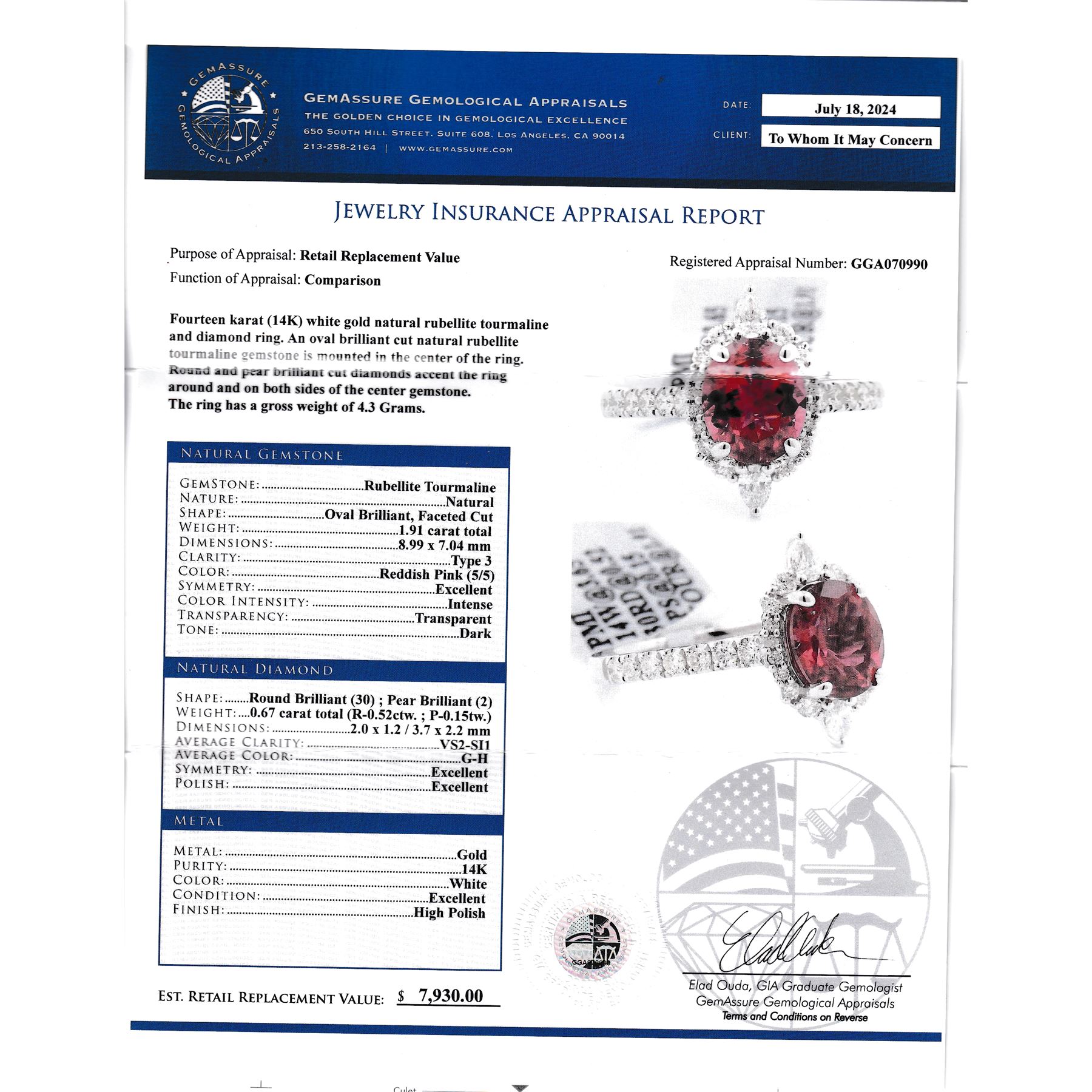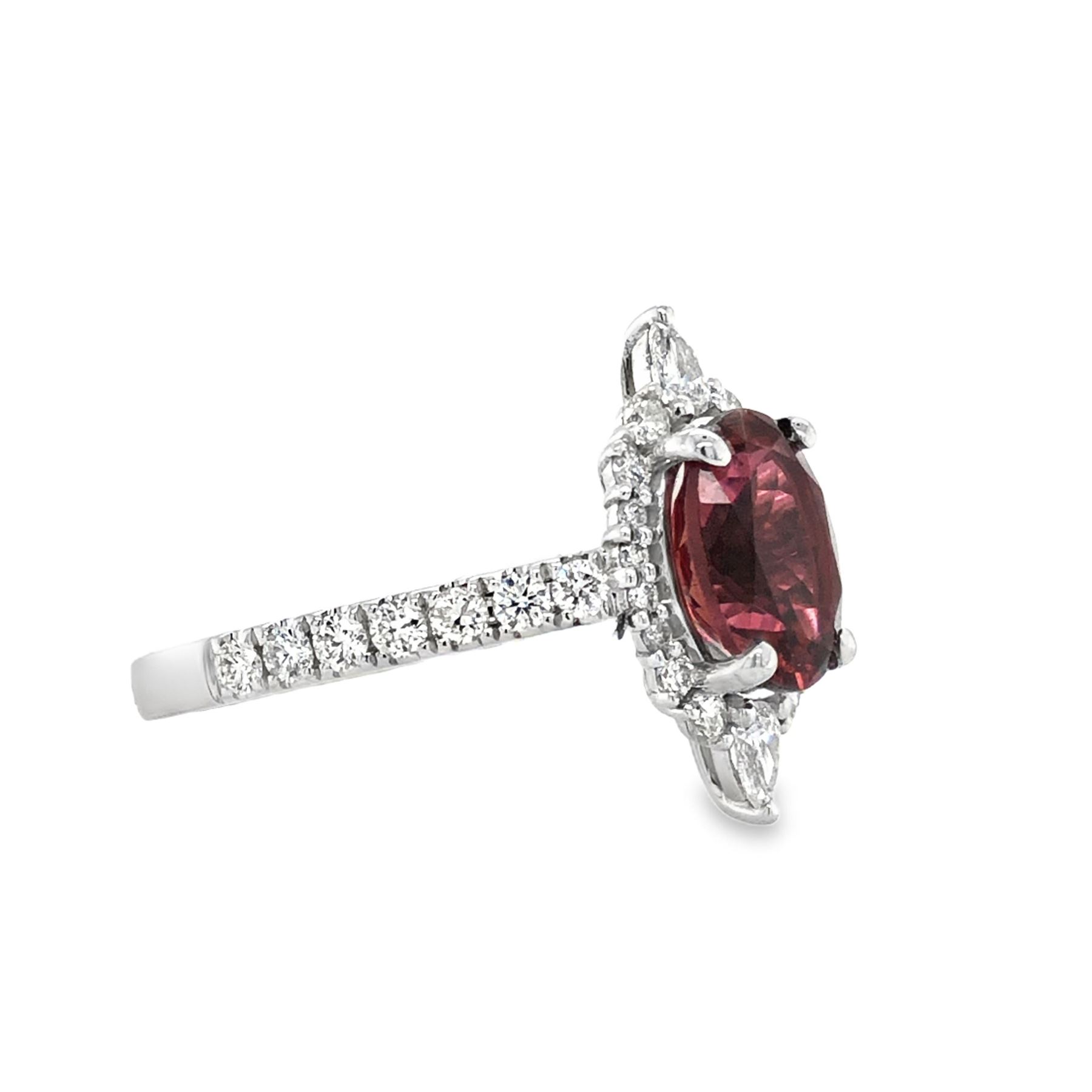 DESCRIPTION DETAIL: A lovely ring featuring an oval shaped Rubellite Tourmaline surrounded by round brilliant cut natural Diamonds and accented by pear shaped natural Diamonds in 14k White Gold.