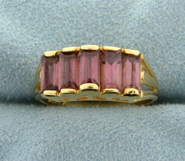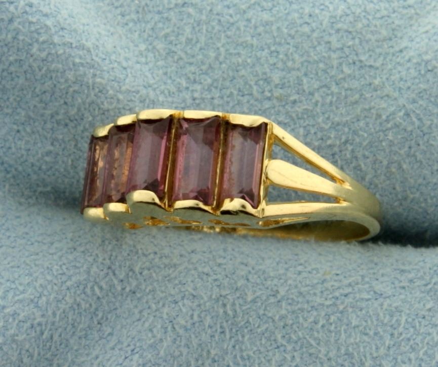 In 14k yellow gold, containing 5 6 by 3mm Emerald cut tourmaline gemstones with excellent clarity and violet color. Size 7. 3.0g