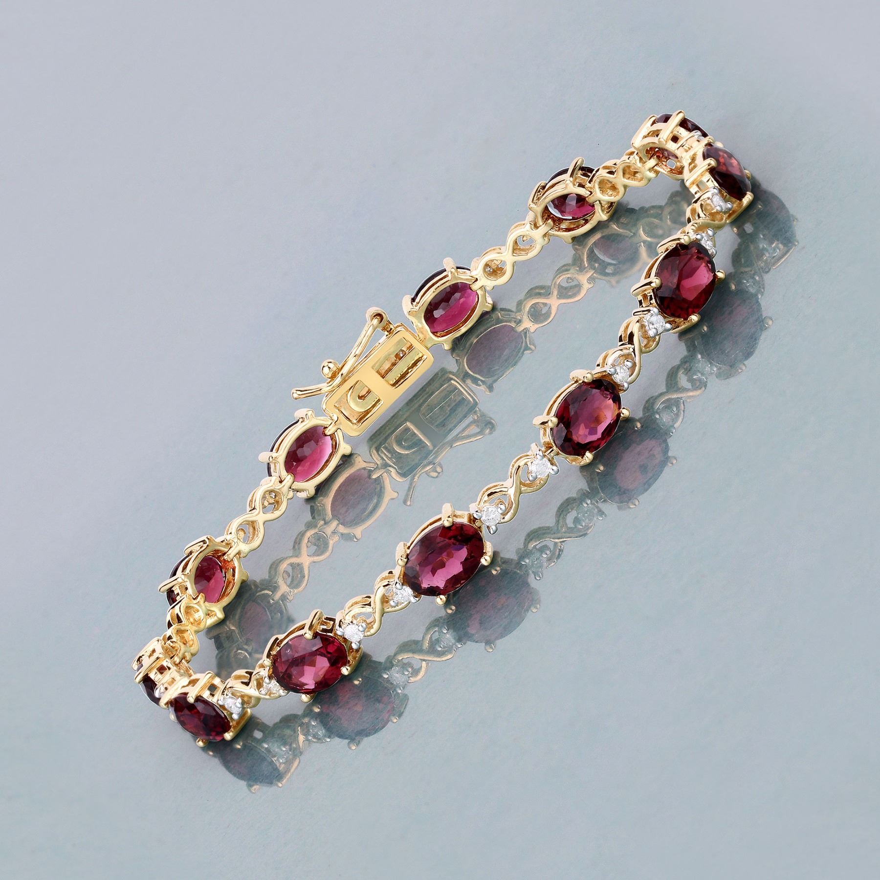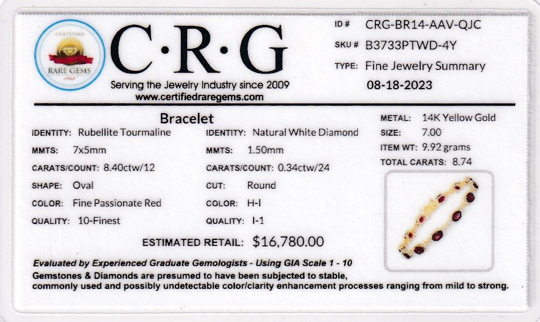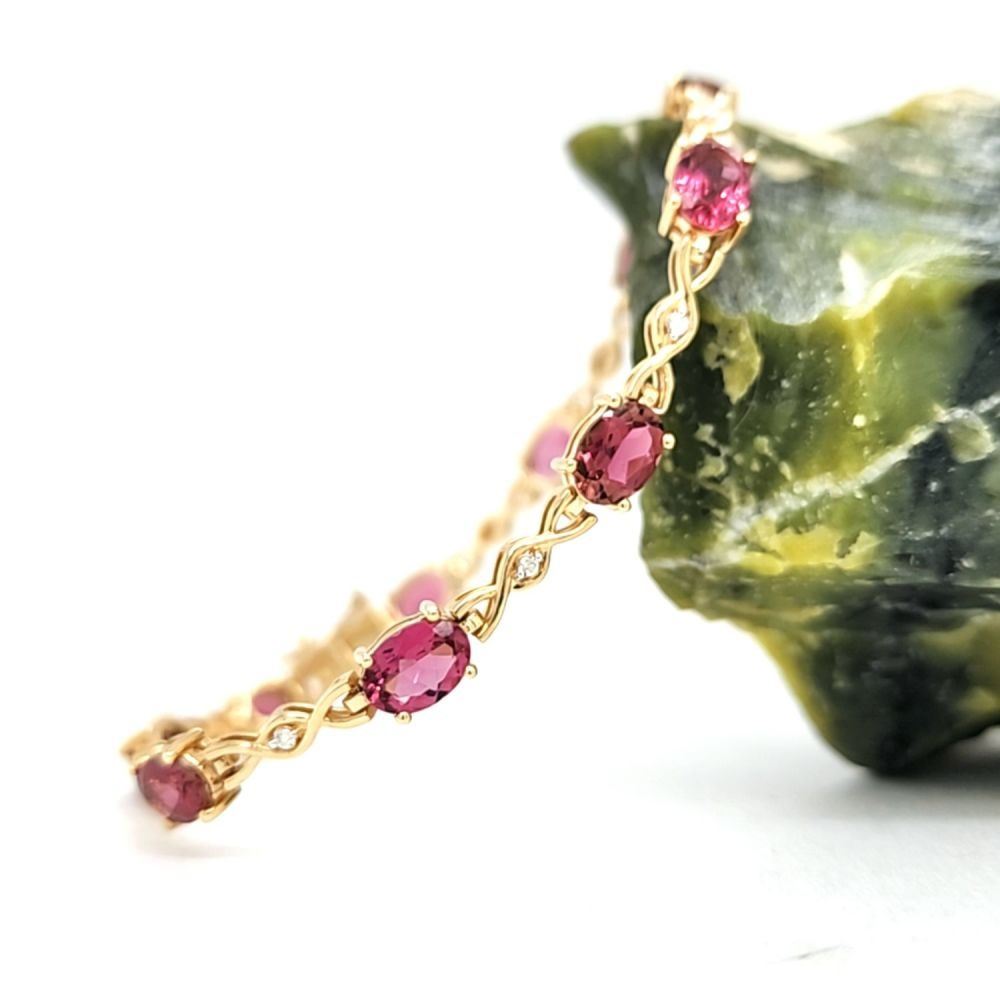 Genuine Tourmaline and Earth-Mined Diamond Bracelet.& nbsp; Major fashion and jewelry designers are forecasting rich, vibrant colors to prevail for the Fall of 2023 and all of 2024.& nbsp; Radiantly colored tourmalines are at the top of the list of trending gemstones!& nbsp; This 14 karat yellow gold bracelet features 8.40 carats of oval-cut and faceted rubellite tourmalines that are prong-set with .34 carats of round, brilliant-cut, H-I color, I1 clarity diamonds intermittently set between the richly colored gemstones.& nbsp; The bracelet is approximately 7& quot; with a hidden box clasp and safety clip.& nbsp; It is hinged for greater flexibility. This bracelet is certified and appraised for $16,780.00 estimated retail replacement value.
