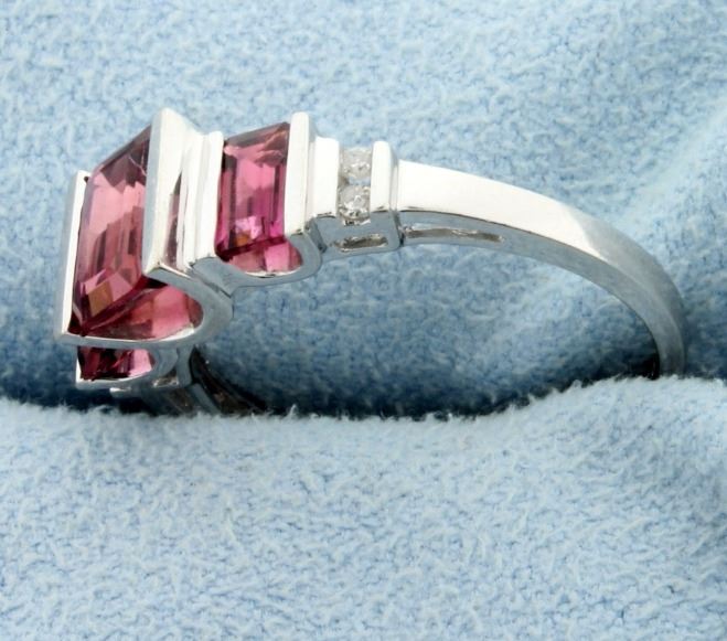 In 14K white gold, this ring contains one 7x5mm and two 5x3mm emerald cut rubellite tourmaline gemstones that have excellent color and clarity. Also there are four .01ct round diamonds. Size 7 1/4 3.6g