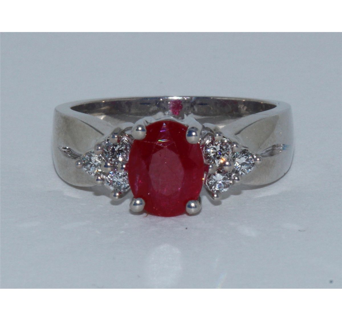 14k White Gold, Ruby Avg 1.50ct Oval Great Deep Red Color, .21cttw Round Diamond G-H color VS-SI clarity