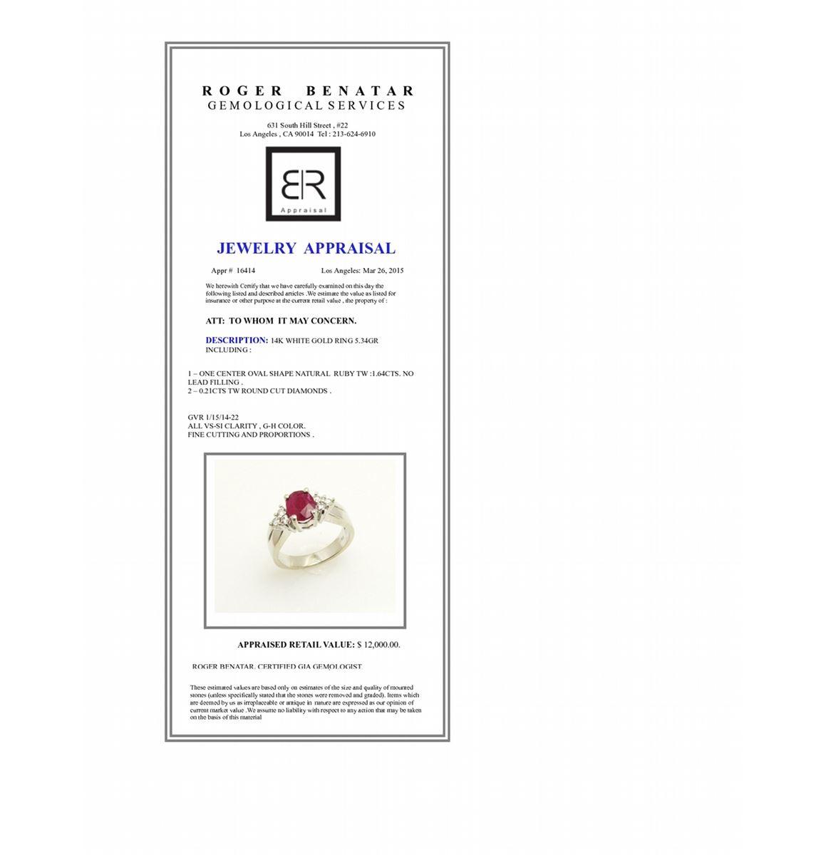 14k White Gold, Ruby Avg 1.50ct Oval Great Deep Red Color, .21ctw Round Diamond G-H color VS-SI clarity