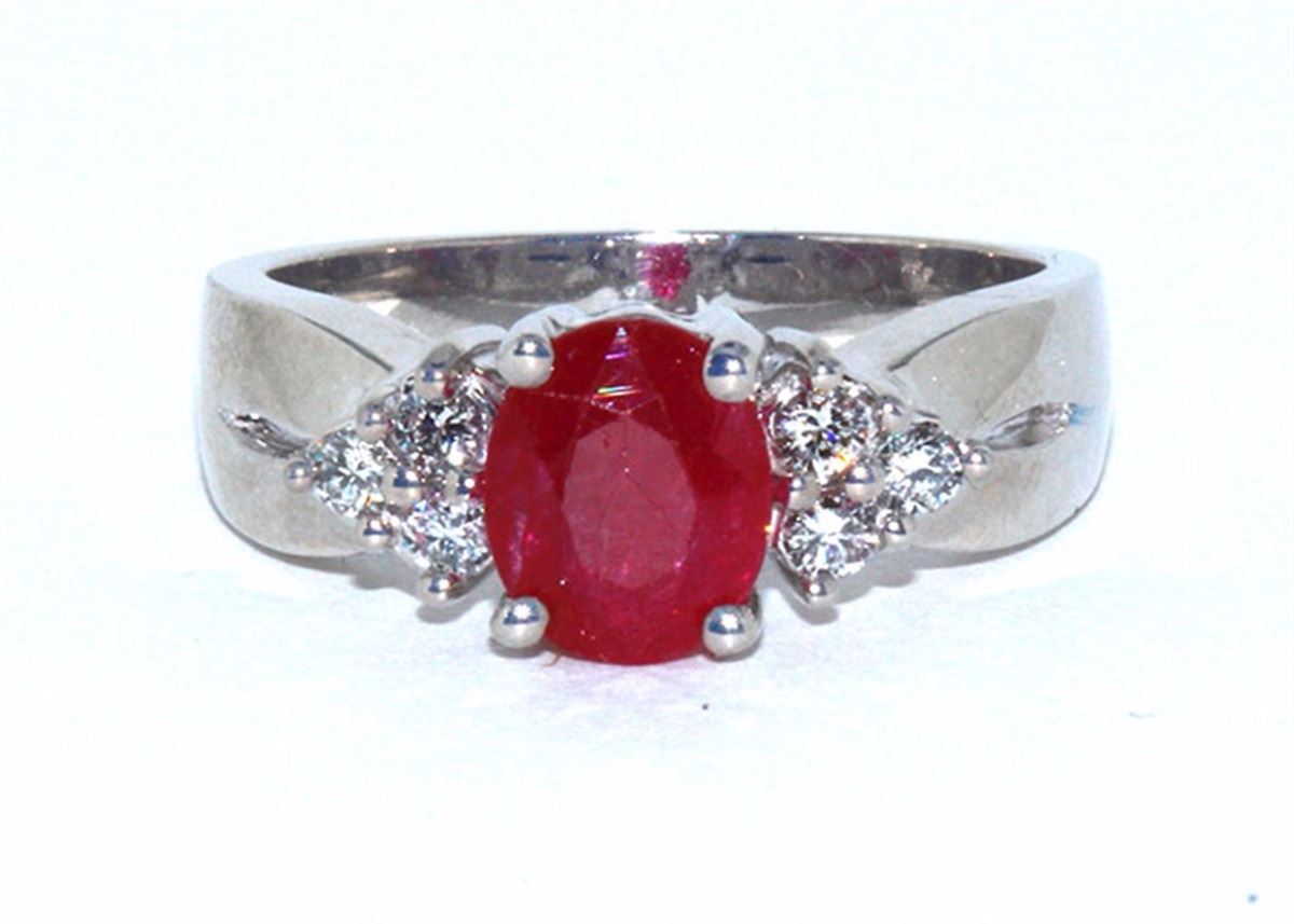 14k White Gold, Ruby Avg 1.50ct Oval Great Deep Red Color, .21ctw Round Diamond G-H color VS-SI clarity