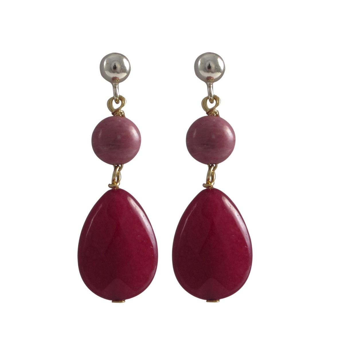 Ruby 10X14mm Teardrop And Rhodonite 6Mm Ball Semi Precious Stones On Gold Plated Sterling Silver Ball Post Earrings, 1.22"