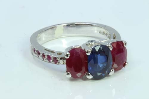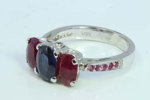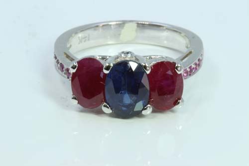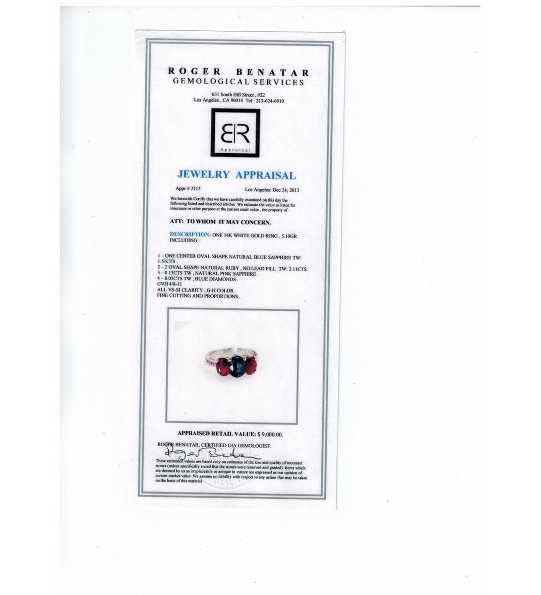 Ruby 2.11ct / BLUE SAPPHIRE 1.51CT / Pink Sapphire 0.13ct / Blue Diamond 0.03ct / 14K White Gold Ring 5.10gram