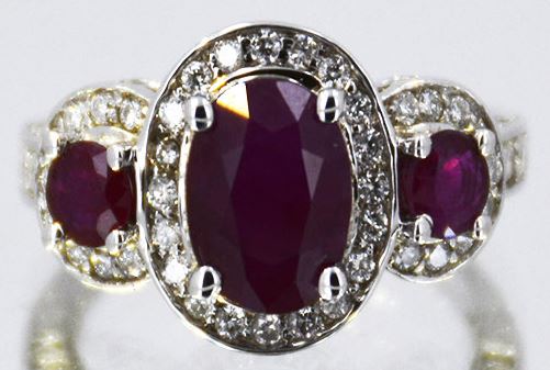 14kt White Gold 4.98 Approx grams including, 3.36ctw 3 stone Ruby oval Deep Red , .73ctw Round Diamond G-H color VS-SI clarity size 6.5, Appraised Retail Value $15,000.00