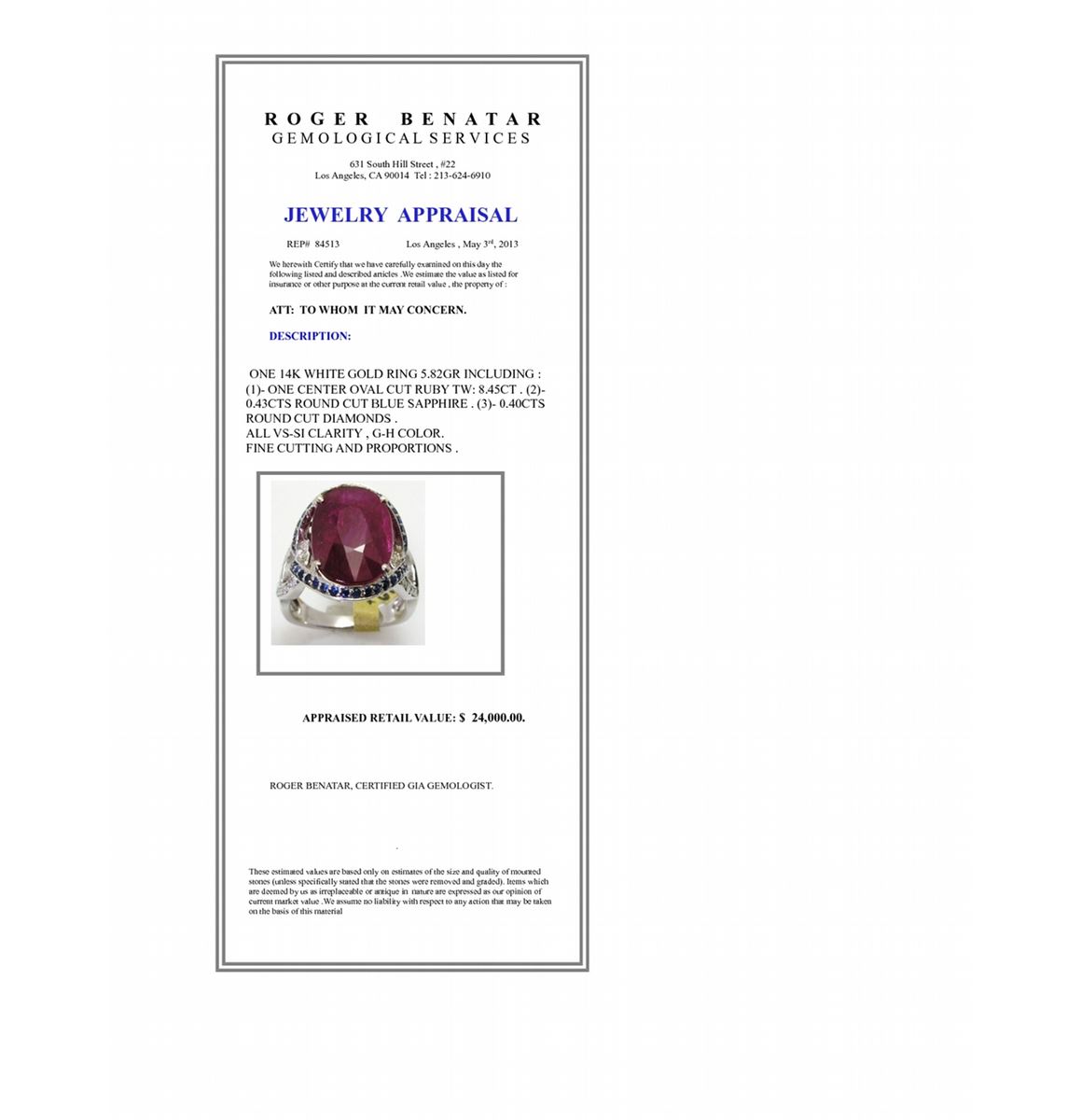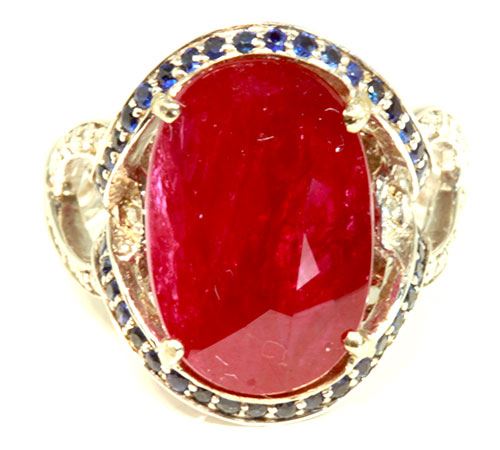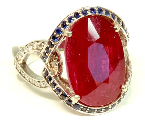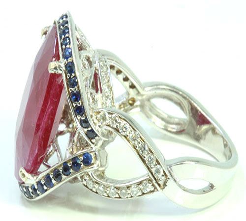 Ruby 8.45Ct / Blue Sapphire 0.43Ct / Diamond 0.40CT / 14K White Gold Ring 5.82 Gram