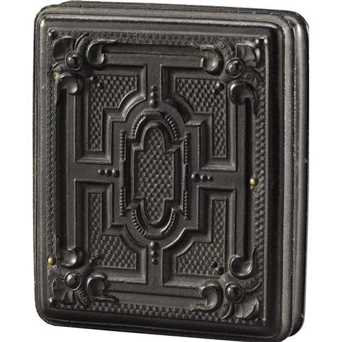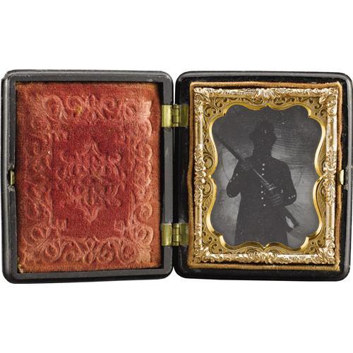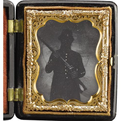<B>Ruby Ambrotype of a Black Union Soldier in Full Uniform,</B></I> 1/9th plate, in a 2" x 3" "Geometric" Union Case (Krainik 482). The soldier, one of the many blacks that joined the Union Forces, is wearing a frock coat and kepi. The case is missing the thumb-piece. The image is dark with some scuffing to the plate. A fine, rare ambrotype.<BR><BR><b>Shipping:</b> Miscellaneous Collectibles, Smal (<a target="_blank" href="http://www.heritageauctions.com/common/shipping.php">view shipping information</a>)