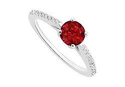 This engagement ring set with round ruby in the center and is accented by smaller prong-set diamonds. Made in polished 14K white gold & has a total weight (TGW) of 0.50 carat and also available matching wedding band model no. W3062BW14D.