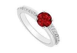 A bigger brilliant-cut round ruby is prong-set in the center. Smaller round diamonds make two rows on the sides of the center stone. Made in 14K white gold & has a total weight (TGW) of 0.50 carat also available matching wedding band model no. W3080BW14D.