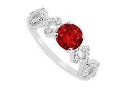 A large brilliant-cut round ruby is prong-set in the center and both side is design like a kite shape accented by smaller round diamonds. Made in 14K white gold this gorgeous engagement ring has a total weight (TGW) of 0.75 carat.
