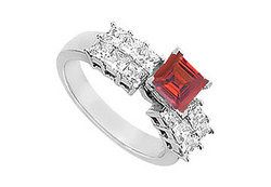 A crimson square ruby is prong-set in the center and is flanked by 12 princess-cut diamonds set in two parallel lines. This 14K white gold engagement ring has a total weight (TGW) of 1.75 ct.