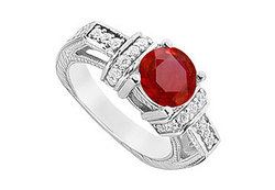 A radiant red round ruby sits in the center. Brilliant-cut round diamonds sparkle in the sleek side designs. Made in 14K white gold this engagement ring has a total weight (TGW) of 2.50 ct.