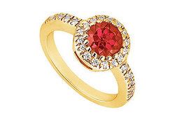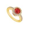 A rich red round ruby is surrounded by smaller brilliant-cut diamonds. Made in 14K yellow gold this engagement ring has a total weight (TGW) of 0.75 ct.