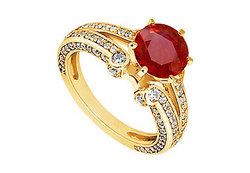 A brilliant-cut  royal red ruby is prong-set in the center. Round diamonds are set in two rows  making V shapes on each side. Made in 14K yellow gold  this engagement ring has a total weight (TGW) of 1.75 ct.