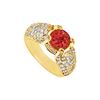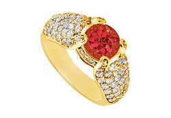 Features a glittering river of 68 brilliant-cut prong-set diamonds. In the center a large round radiating ruby is prong-set atop. Exquisitely rendered in 14K yellow gold this ring has a total weight (TGW) of 2.00 ct.