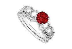 These gorgeous engagement ring & wedding band set with center hold a bigger prong-set round ruby and both side make a small round circle accented by sparkling brilliant-cut diamonds along with matching curve wedding band to make a perfect set of ring. Made in 14K white gold & has a total diamond weight (TGW) of engagement ring 0.60 carat and wedding band as 0.15 carat.