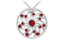A bezel-set red round ruby takes the center stage surrounded by smaller brilliant-cut rubies and set atop a brilliant-cut diamond adds a touch of style. Made in 14K white gold this pendant has a total weight (TGW) of 0.75 ct.
