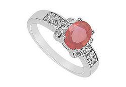 An oval vivid red ruby is prong-set in the middle of a brilliant-cut diamonds row. Four round diamonds are bezel-set slightly below the centerstone. Made in 14K white gold this ring has a total weight (TGW) of 1.75 ct.