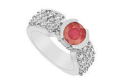 A round  radiant ruby is half bezel-set in the center. Brilliant-cut  round diamonds are prong-set in three rows on both sides. Made in 14K white gold  this ring has a total gem weight (TGW) of 2.00 ct.