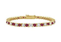 Get caught in the rapture of rubies and diamonds. Radiant round rubies alternate with brilliant-cut diamonds in a 18K yellow gold prong-setting. With gems consistent all around it symbolizes your eternal love. This tennis bracelet has a total gem weight (TGW) of 2.00 ct.