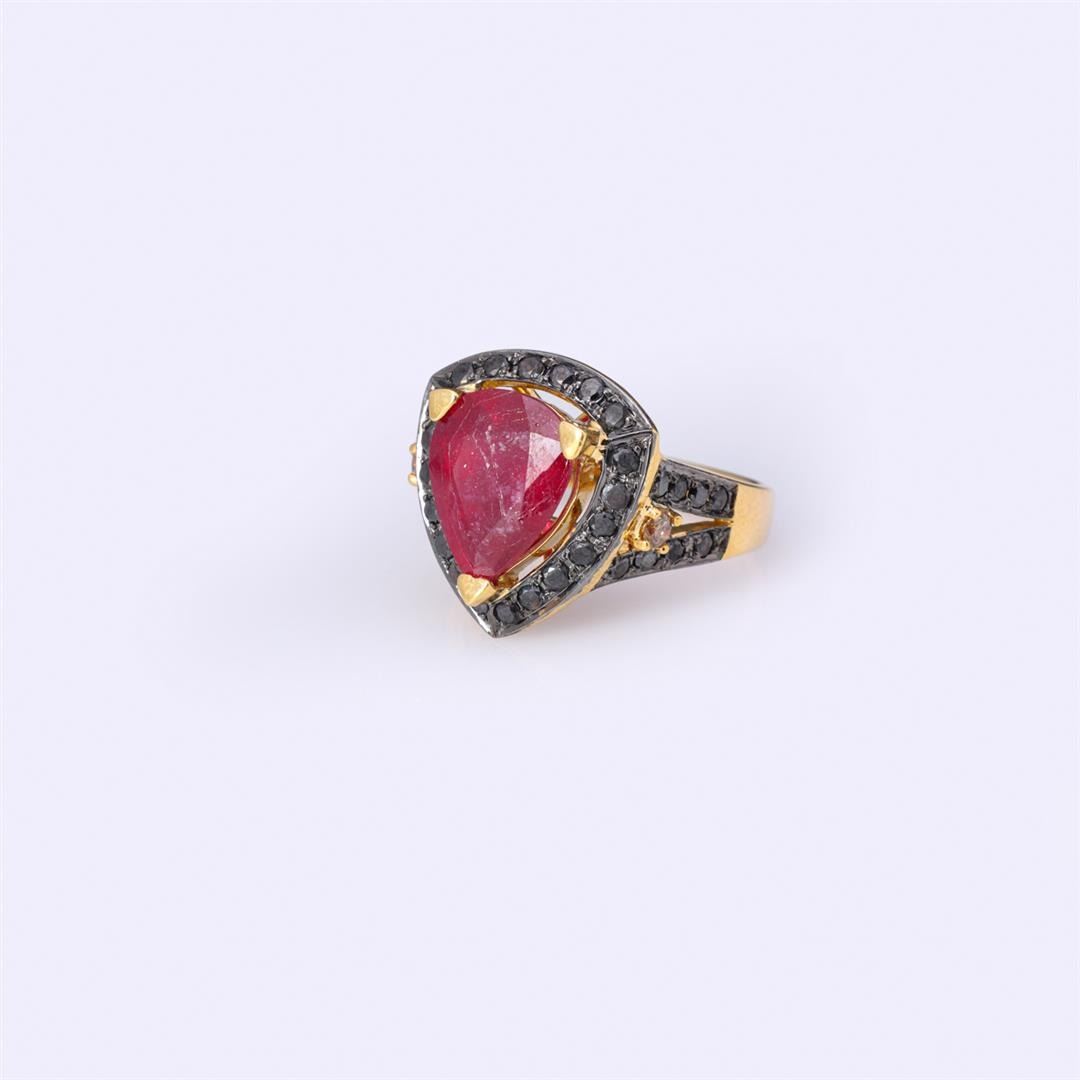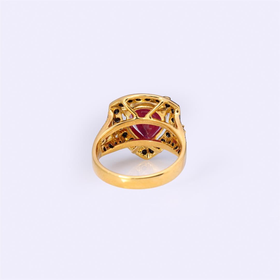 A large pear shaped ruby, claw mounted in a shield shape surrounded by numerous black diamond borders continuing to on each shoulder to the shank in 18k yellow gold by Carlo Rici, the interior of the ring with hallmark and marked CR750 750; gross weight 8