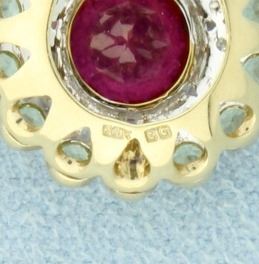 In 14K yellow gold, contains one 2ct round beautiful ruby gemstone with excellent color and clarity. As well as seven 1/2pt diamonds and fourteen .03ct round peridot gemstones. The pendant is 5/8 inch in diameter. 2.5g