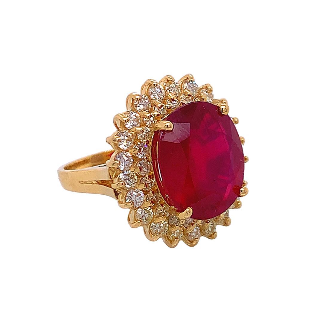 Ruby Cocktail Ring. Please see Photos and Description for all available information. This stunning cocktail ring features a 9.85ct ruby gemstone and a 1.51ct diamond in 14K yellow gold. The ruby gemstone is fracture-filled with a permanent, red color and set in a prong setting. This ring is perfect to wear on a daily basis due to its practicality, comfort and beautiful design.