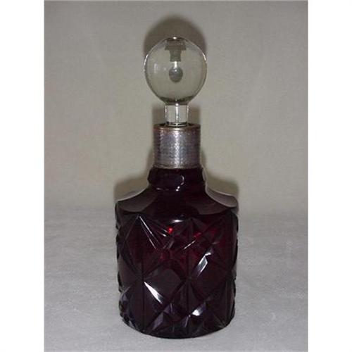 Crystal Decanter, Flashed with Ruby color, with clear stopper.10 1/2" tall x 4 1/2" diameter. Silvered brass collar on neck.