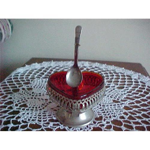 Ruby color server, Made in England, Heart shape in case with filigree metal and spoon holder--spoon is silver plate, Sheffield.
