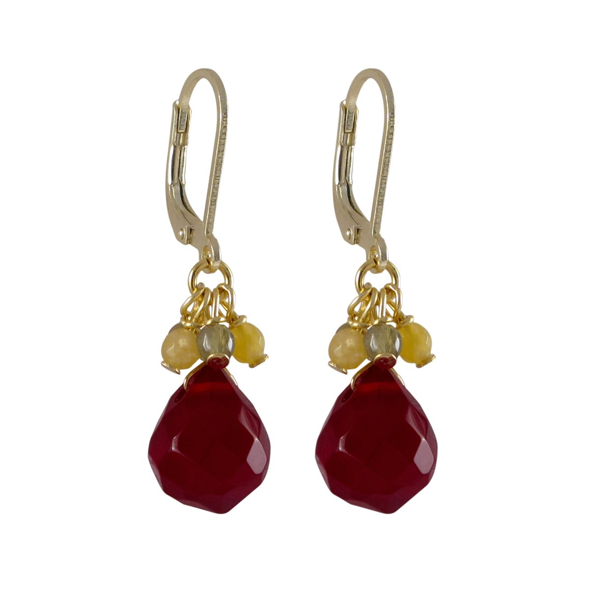 Ruby Combination Semi Precious Stones On Gold Plated Brass Lever Back Earrings, 1.42"