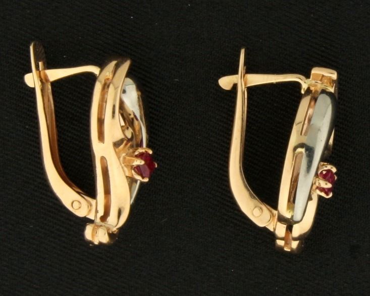 In 14k white and yellow gold. Each earring contains a natural square shaped 2.2mm ruby gemstone with a beautiful red color and excellent clarity. 3/4 inch long. 5.3g.
